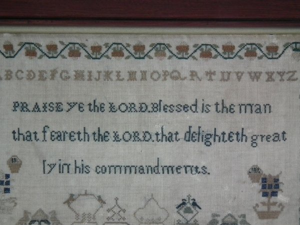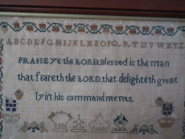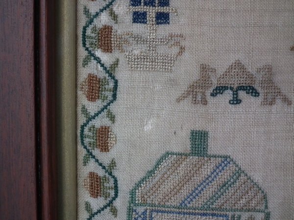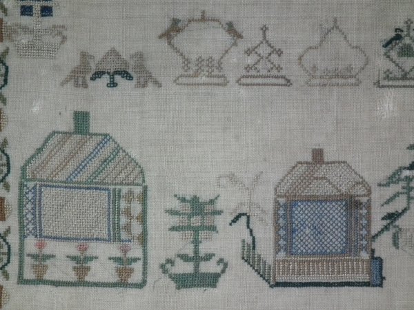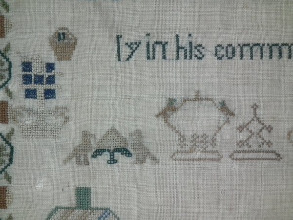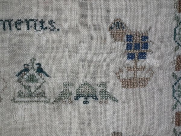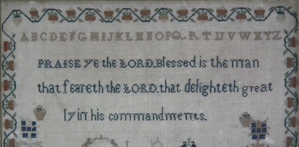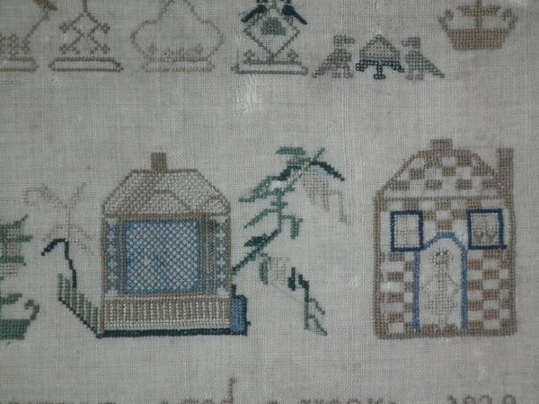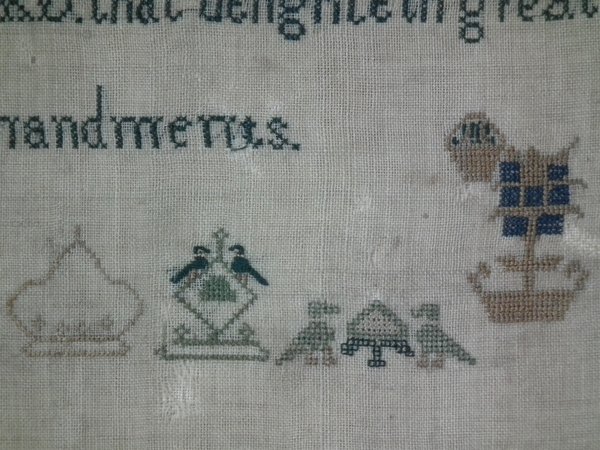 The sampler is worked in silk on linen ground, in a variety of stitches.