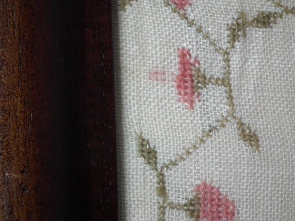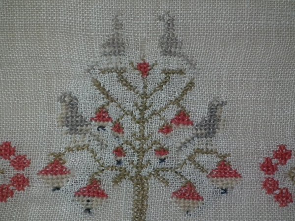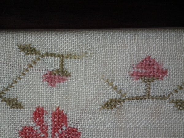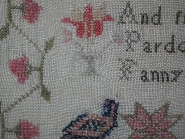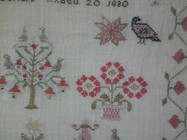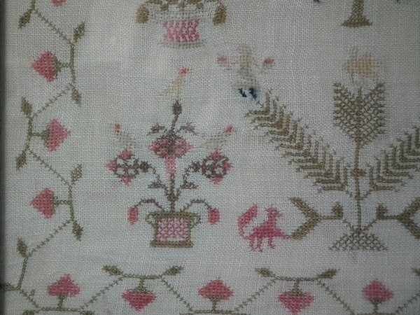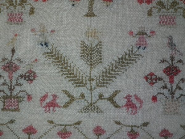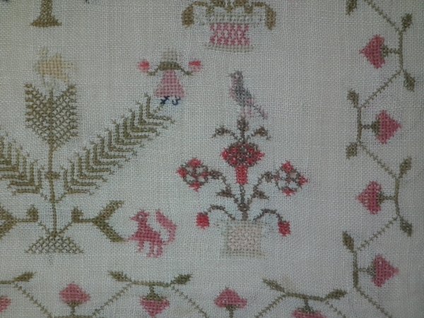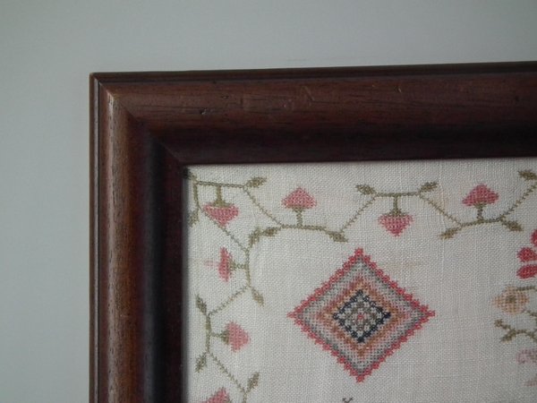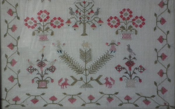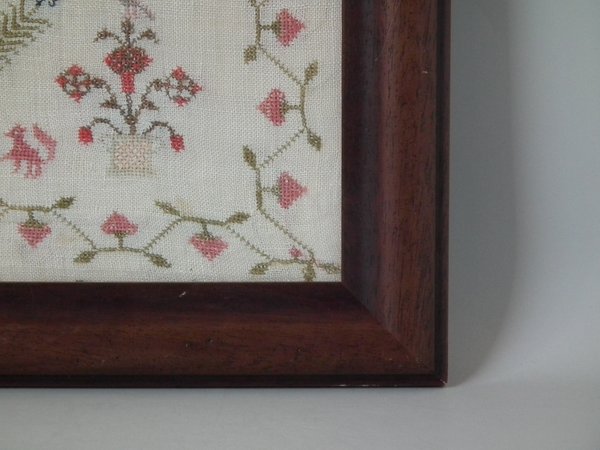 The sampler is worked in fine wool and silk on linen ground, in cross stitch throughout.