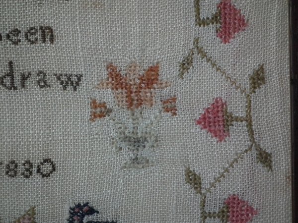 William IV, dated 1830. 18.5ins by 14.5ins wide. Antique Sampler, 1830, by Fanny Hadfield. Framed in an modern wood frame with glass.
