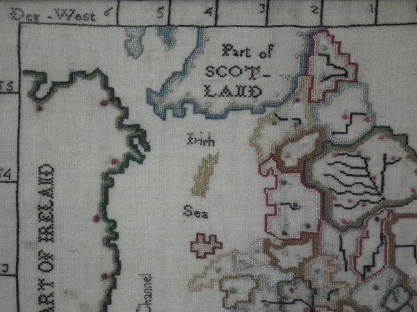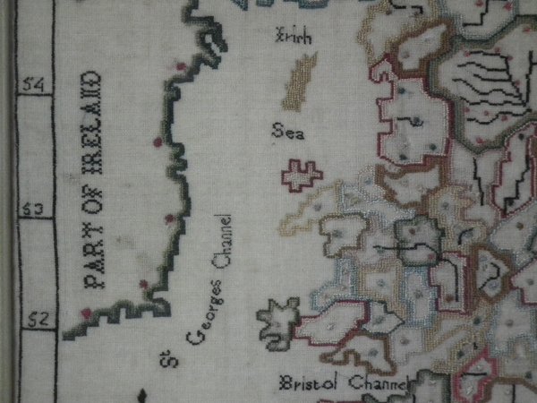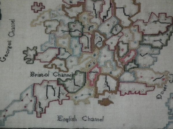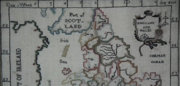 Depicts a map of England and Wales with counties and surrounding seas and islands. Unusually, this sampler has some of the major rivers of the UK marked.