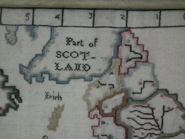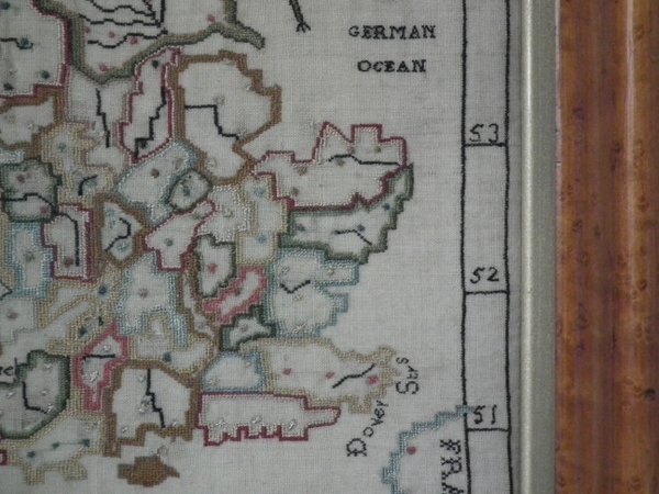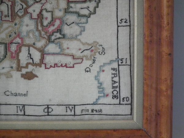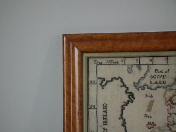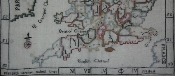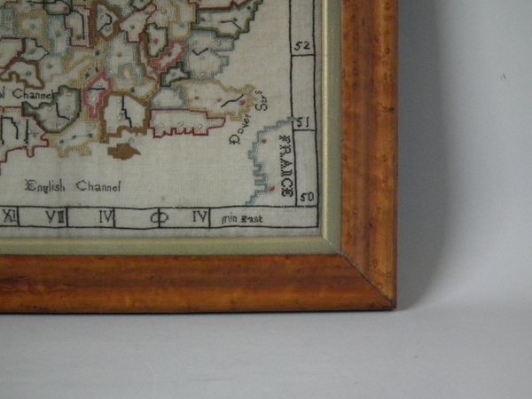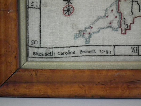 George III, dated 1783. 11.5ins high by 12.5in wide. 1783 Map Sampler by Elizabeth Caroline Foskett. Framed in an old, burr maple frame with gilt slip and glass.