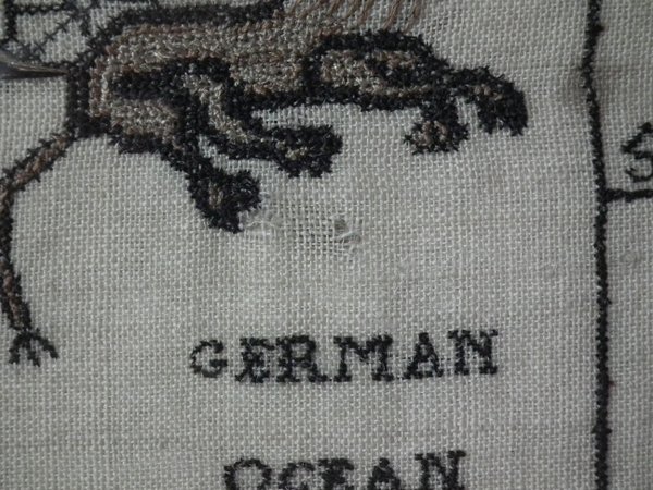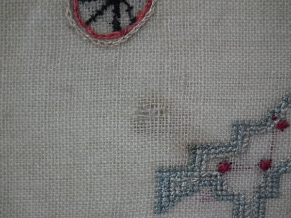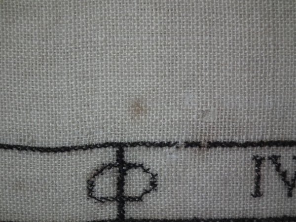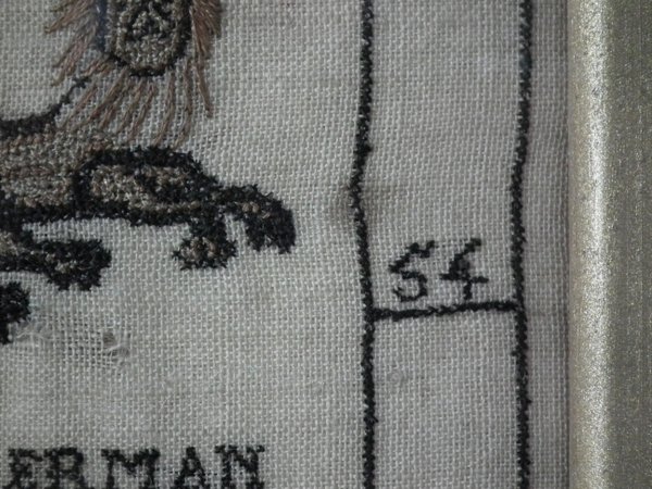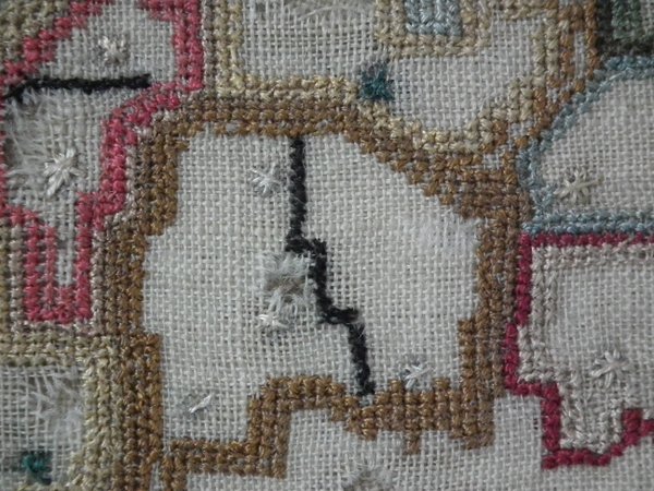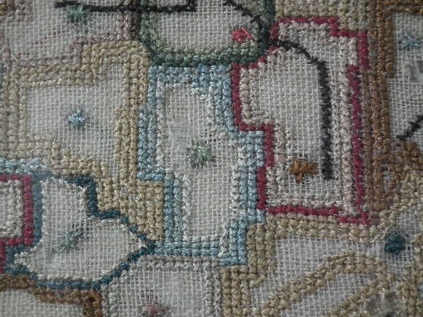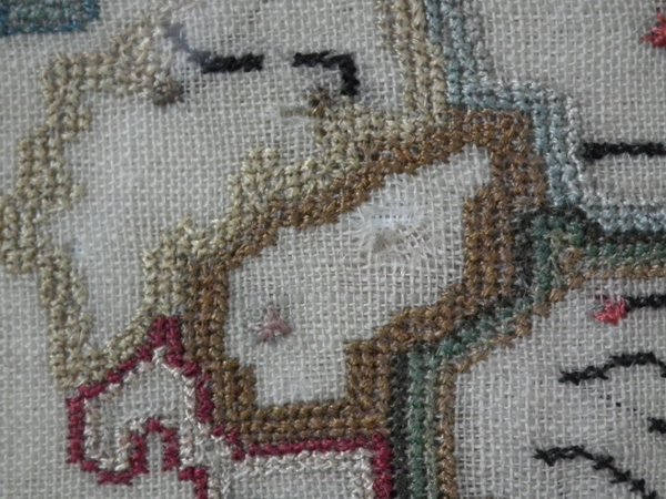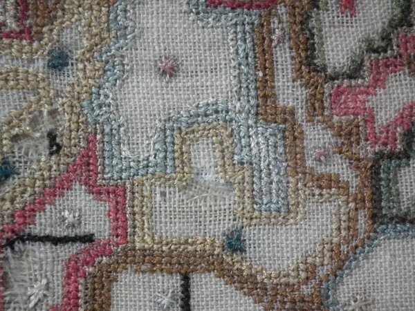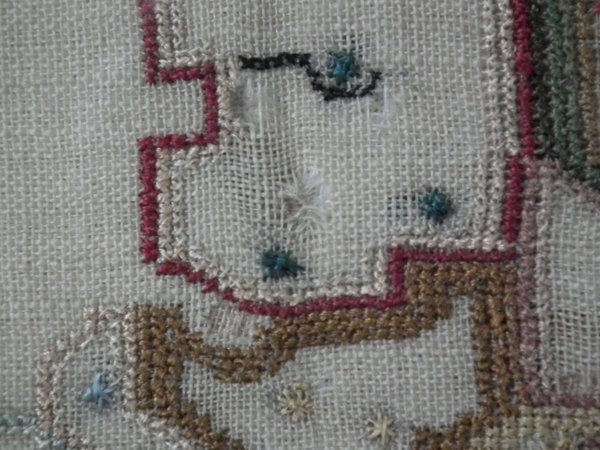 The sampler is worked in a silk-like thread on linen ground, in a variety of stitches.