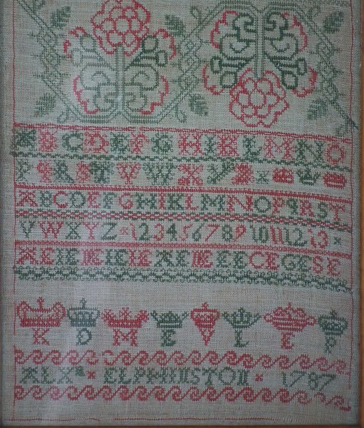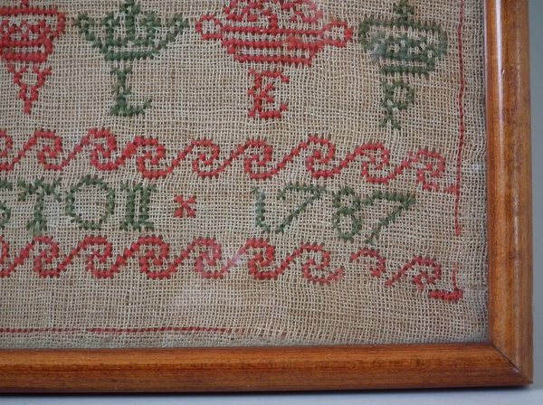 George III, dated 1787. 21.75ins by 8.75ins wide. 1787 Sampler by Alexandra Elphinston.