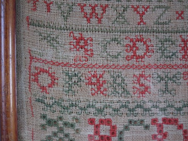 The sampler is worked in fine wool on linen ground, in a variety of stitches including Algerian eye.
