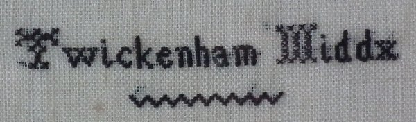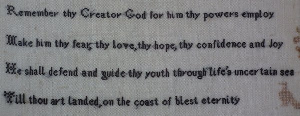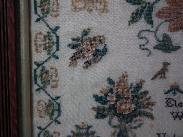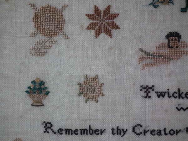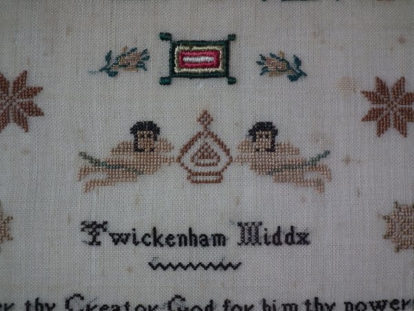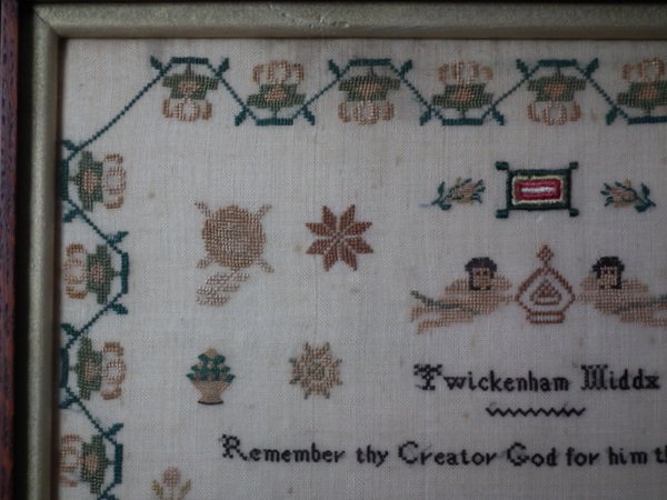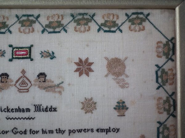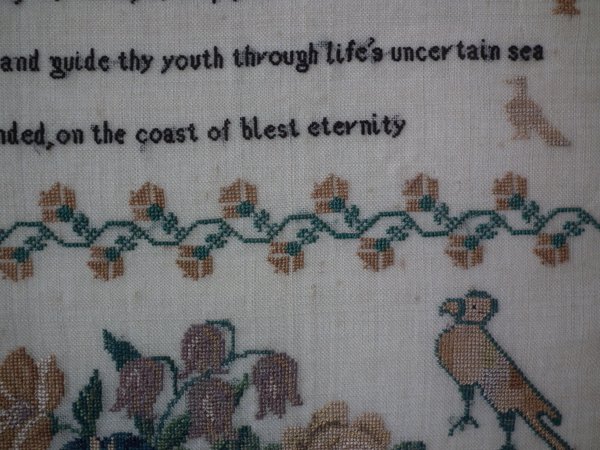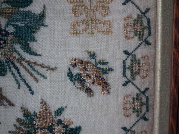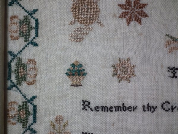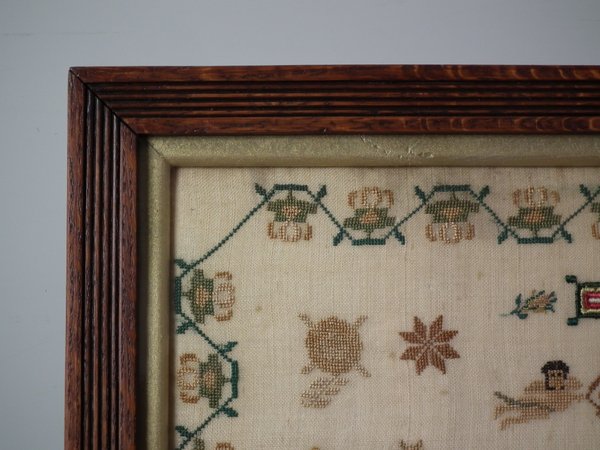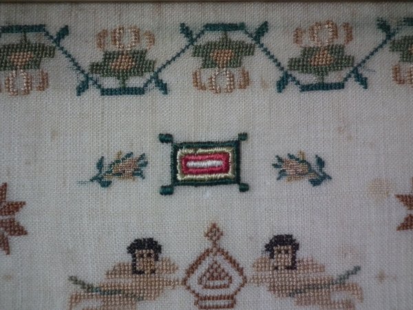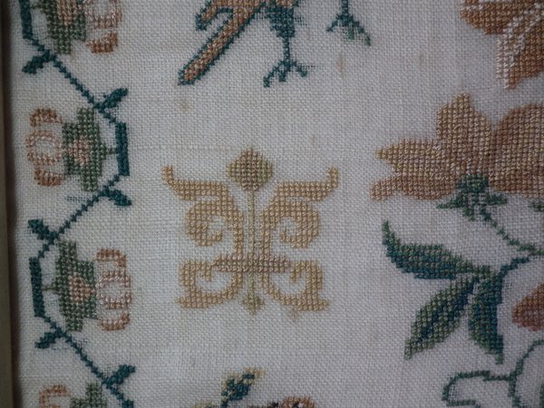 The sampler is worked in silk on linen ground, in cross stitch throughout.