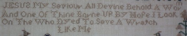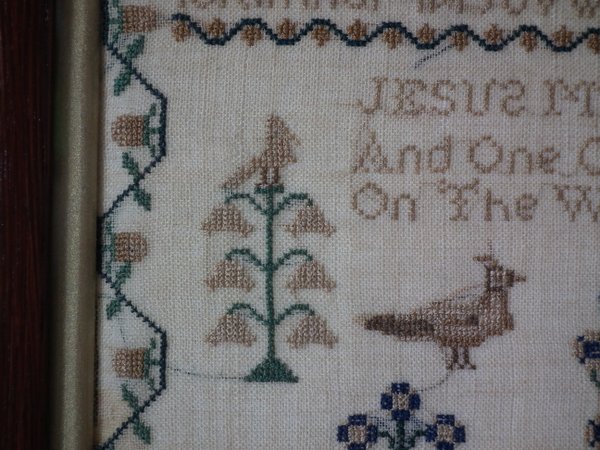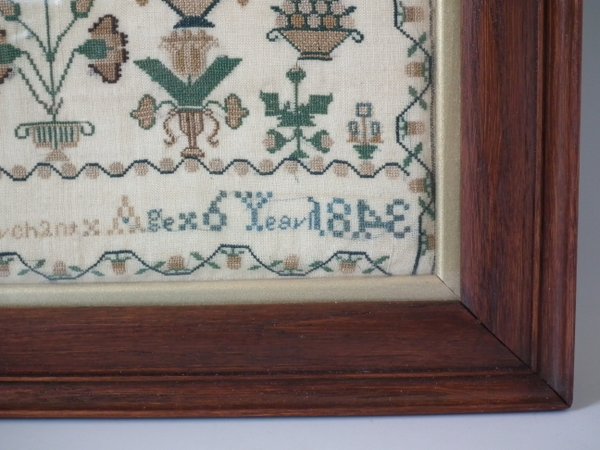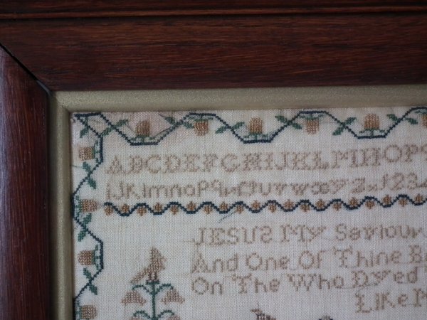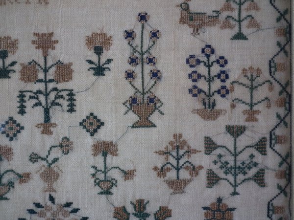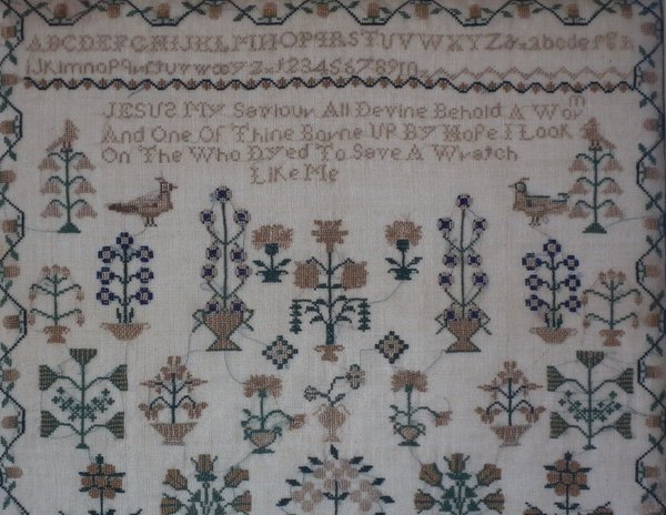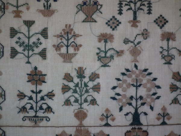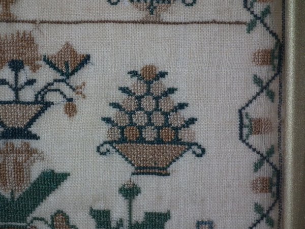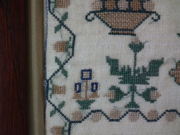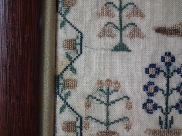 The sampler is worked in silk on linen ground, in cross stitch throughout.