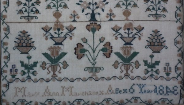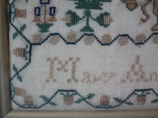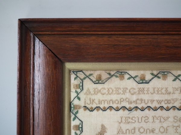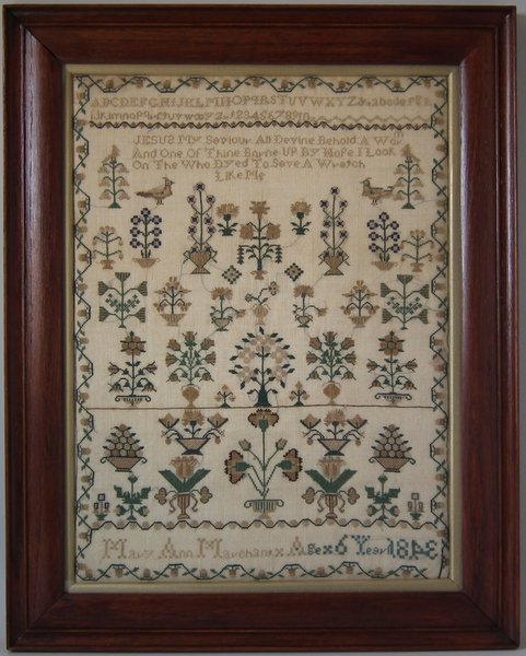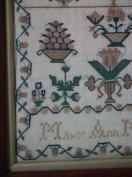 1843 Sampler by Mary Ann Marchant. Framed in an old wood frame with gilt slip and glass.