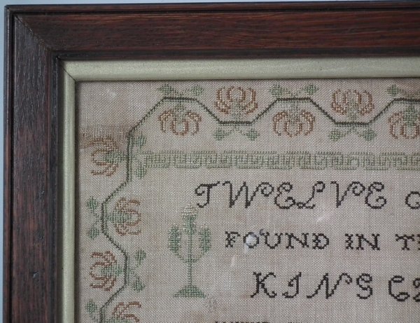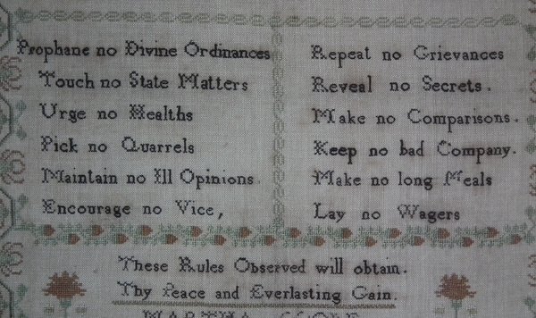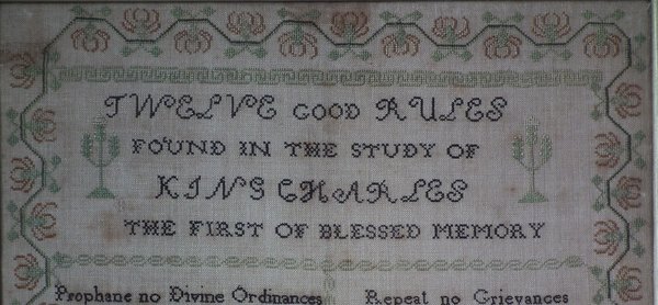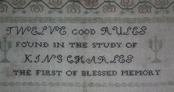 George III, dated 1811. 16.75ins by 16.25ins wide. 1811 'King Charles and 12 Good Rules' Sampler by Martha Cooke.