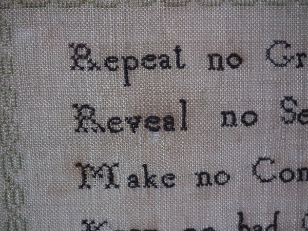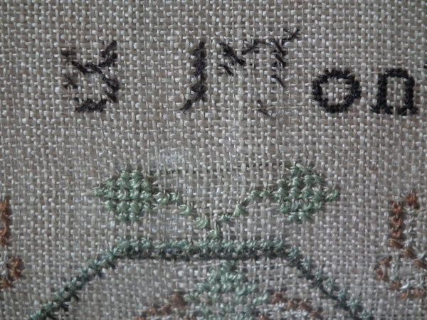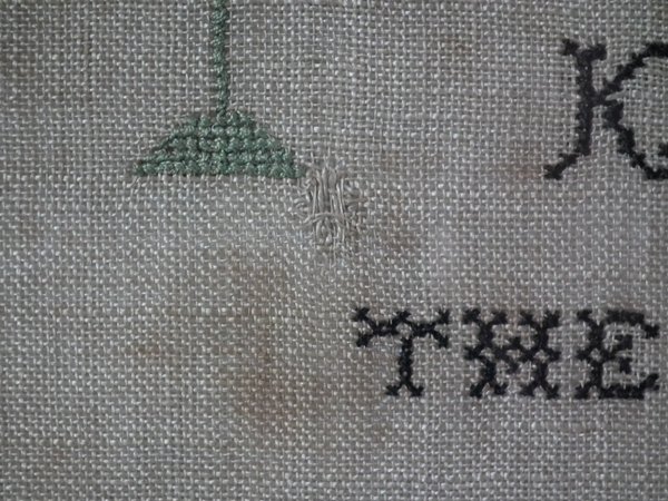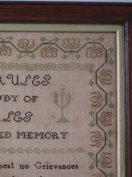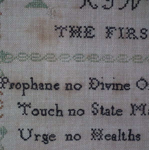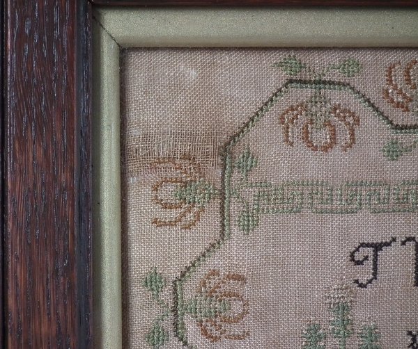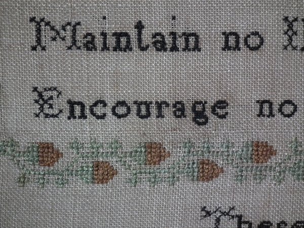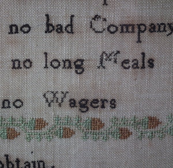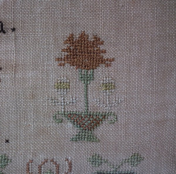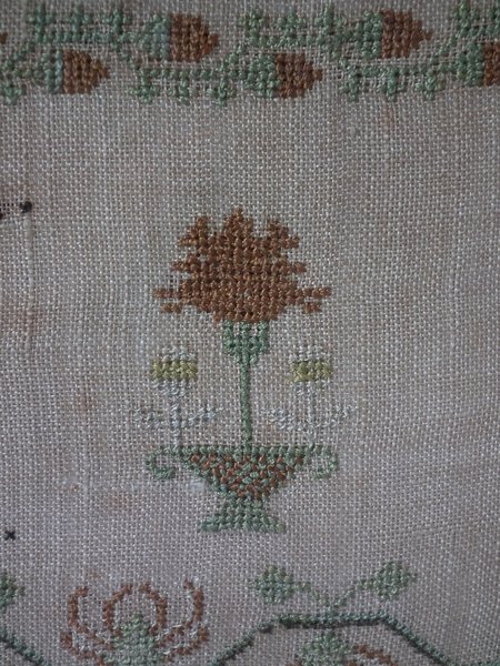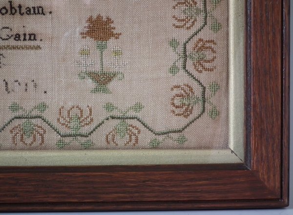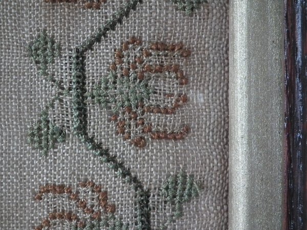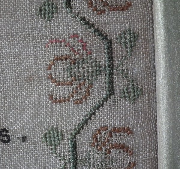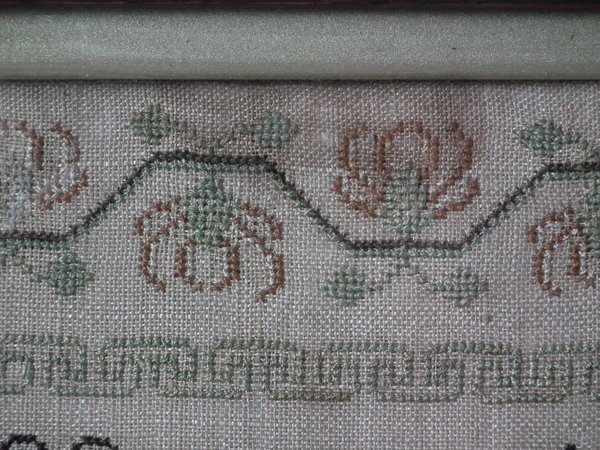 The sampler is worked in silk on linen ground, in cross stitch throughout.