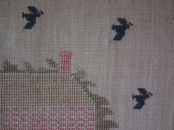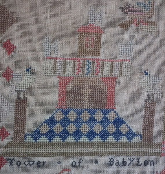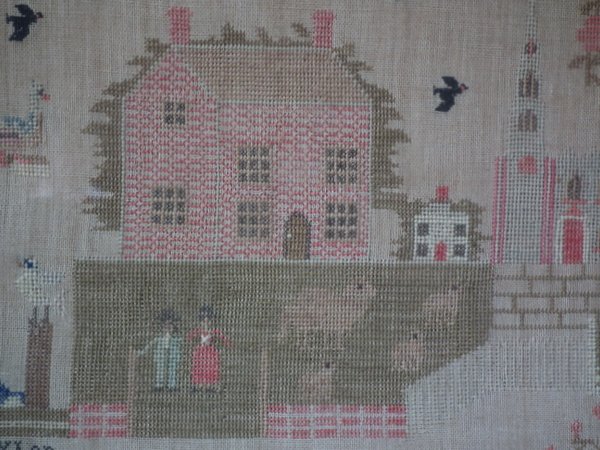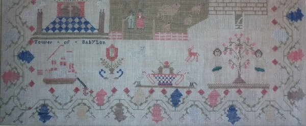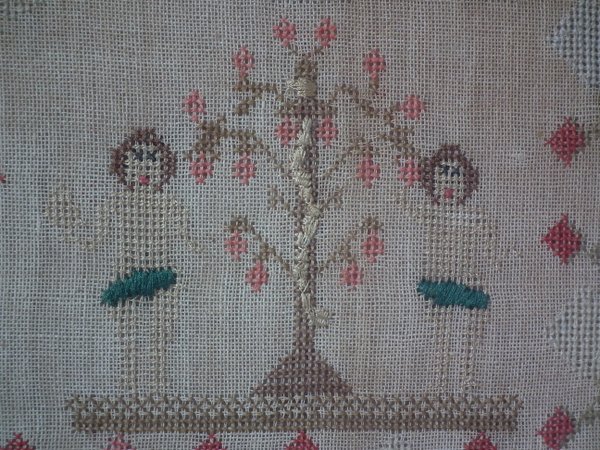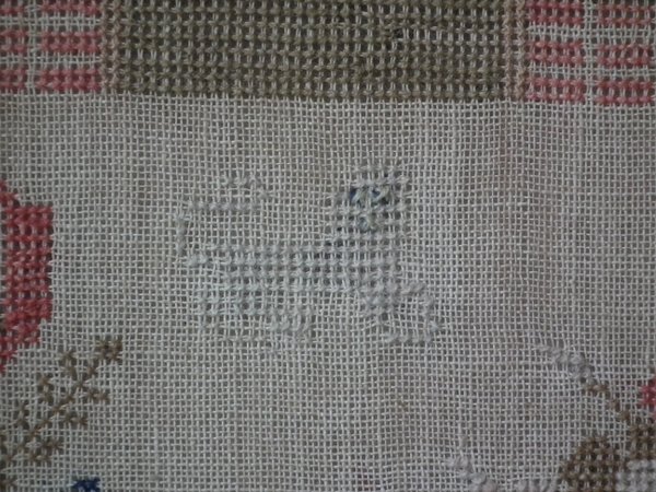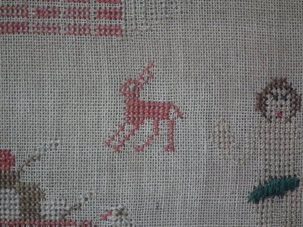 The sampler is worked in silk and cotton on canvas ground, in a variety of stitches.