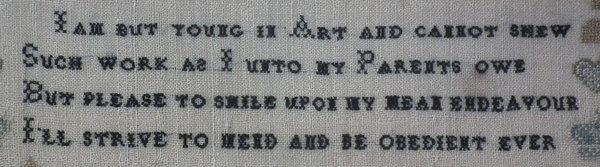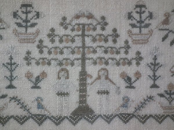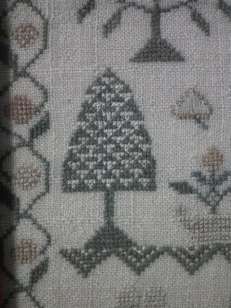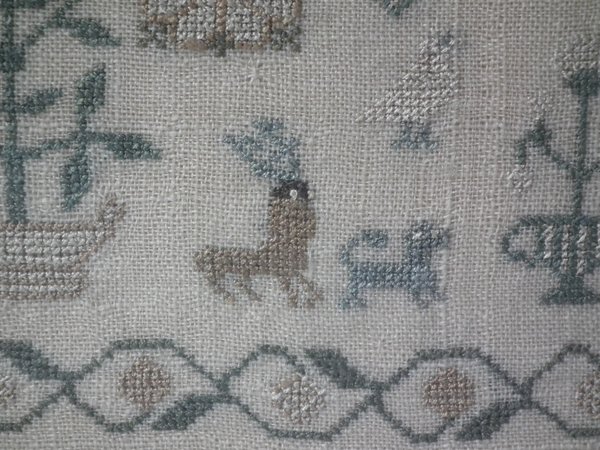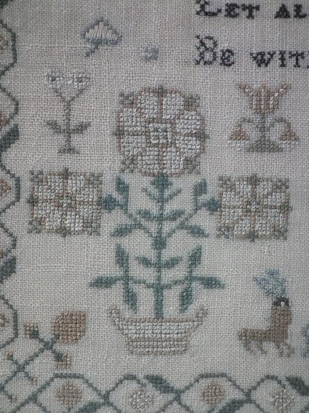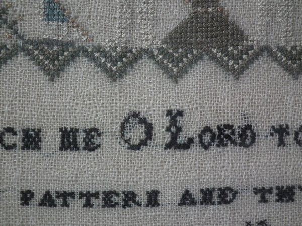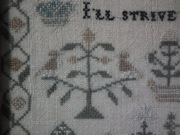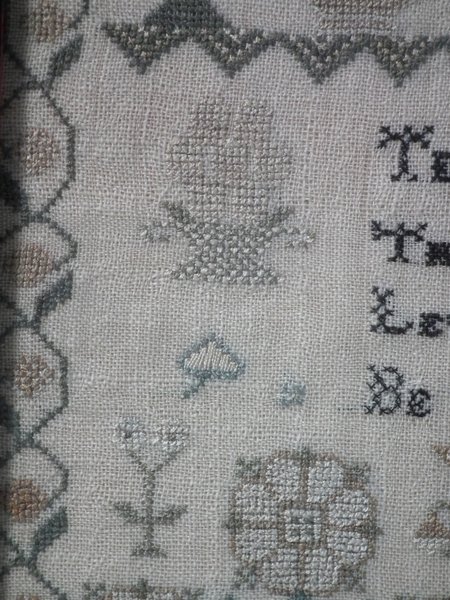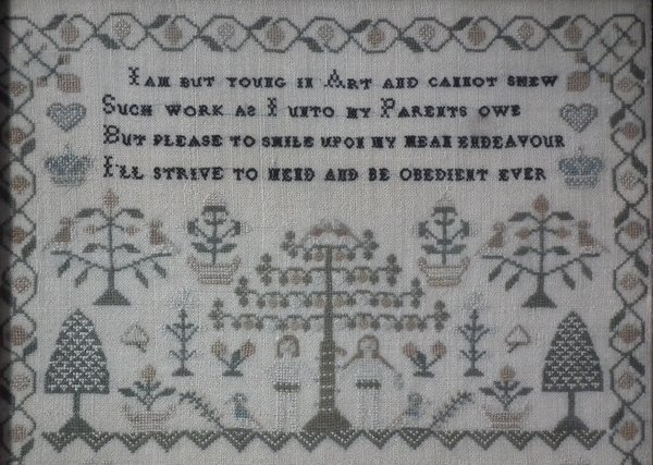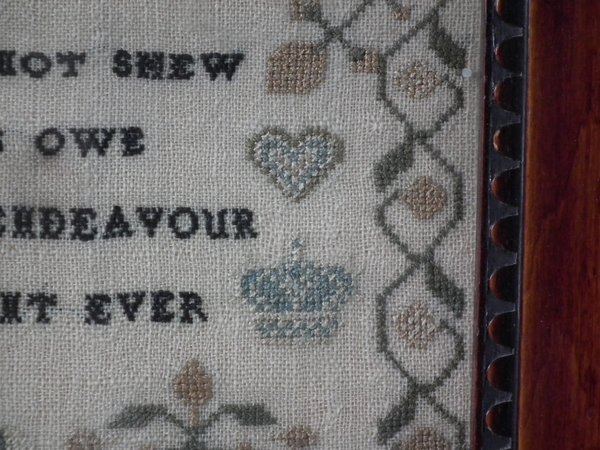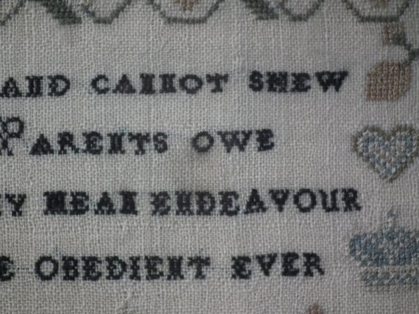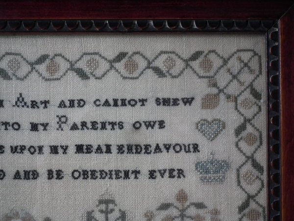 The sampler is worked in silk on linen ground, in a variety of stitches.