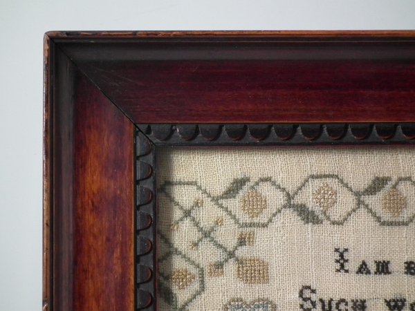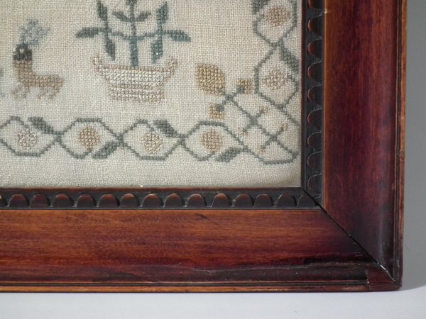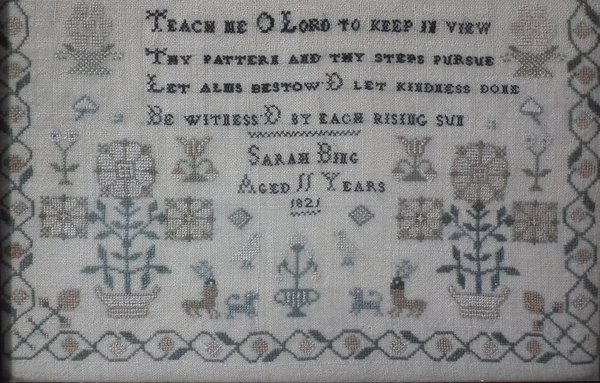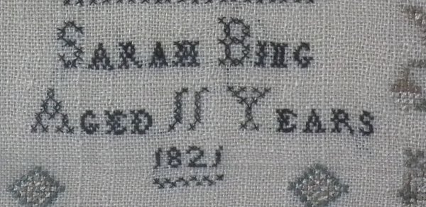 George IV, dated 1821. 16ins by 11.75ins wide. 1821 Sampler by Sarah Bing. Framed in an old wood frame with rippled, old glass.