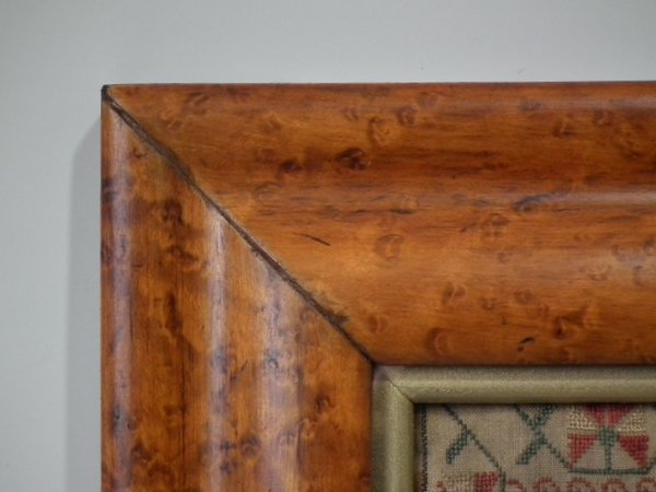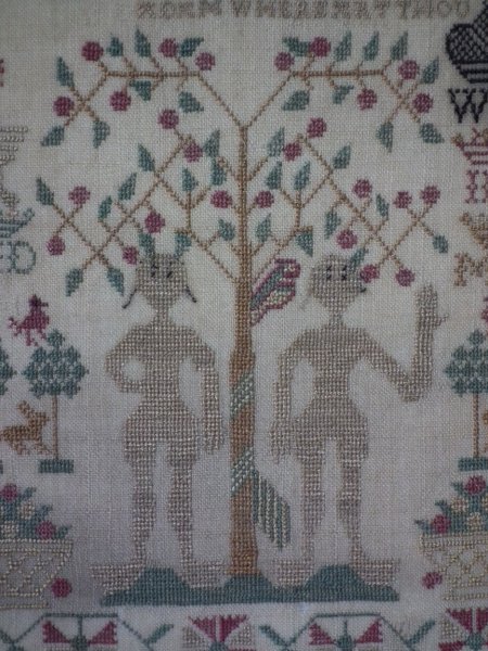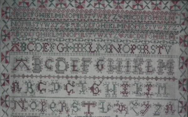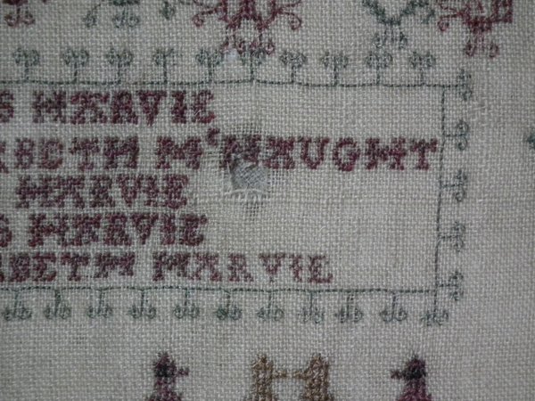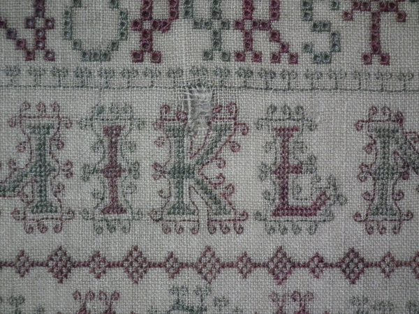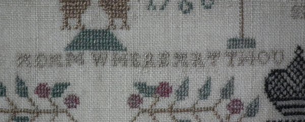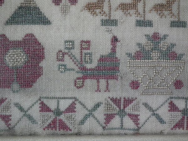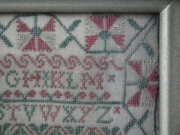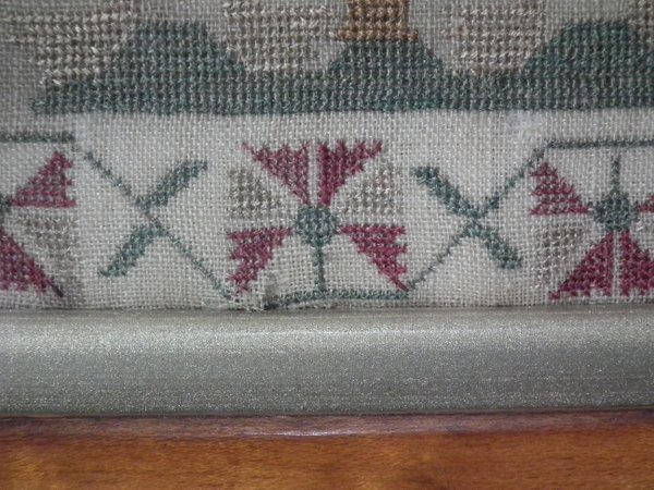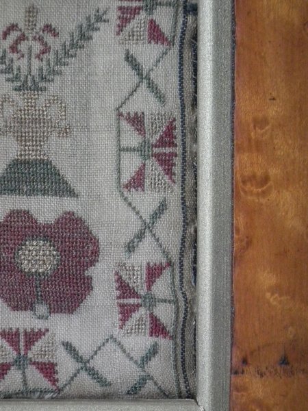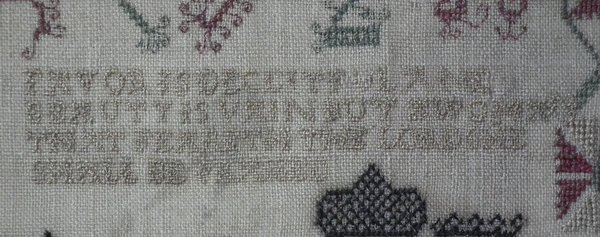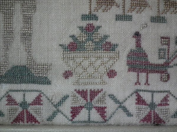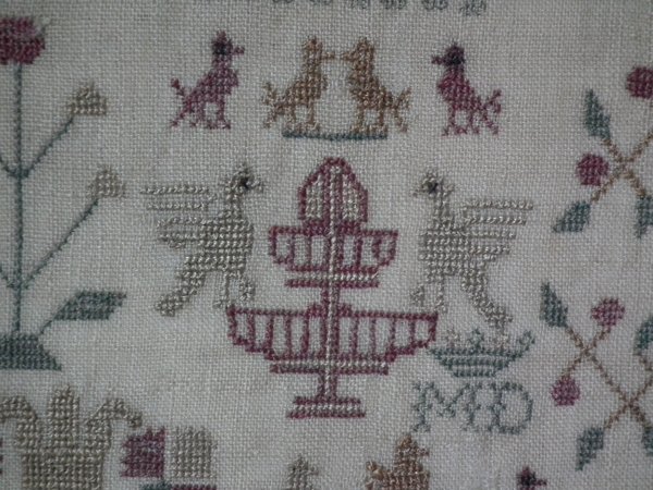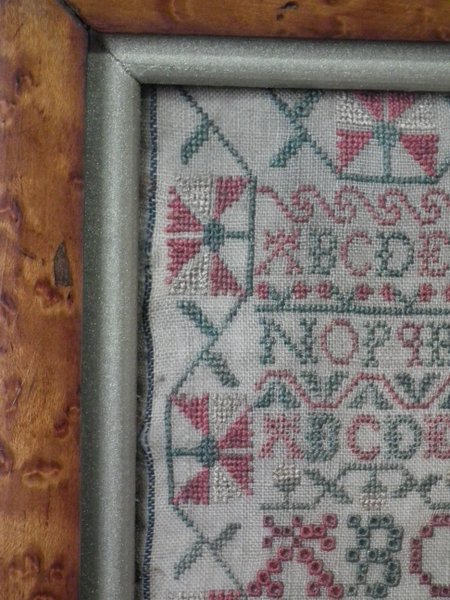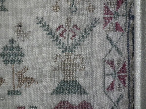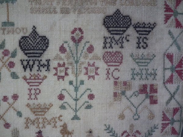 The sampler is very finely worked in silk on linen ground, in a variety of stitches including Algerian eye.