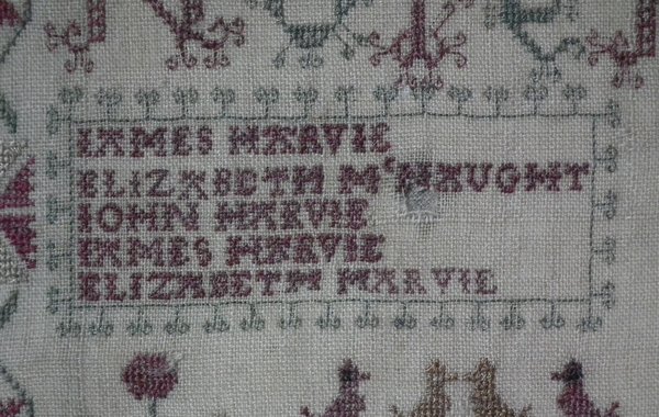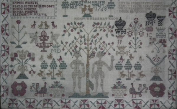 George III, dated 1768. 15.25ins by 12.25ins wide. 1768 Scottish Sampler by Christian Harvie.