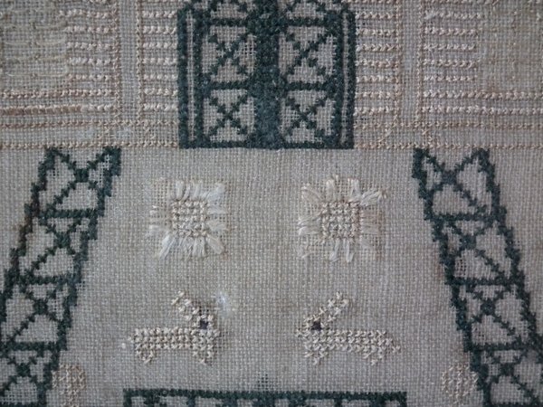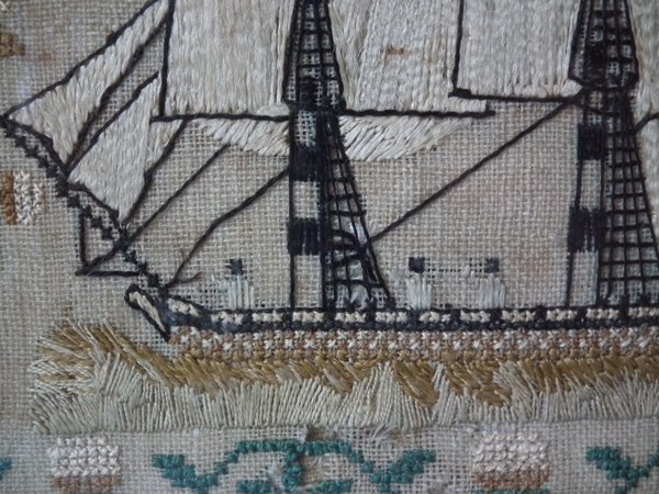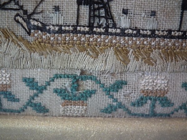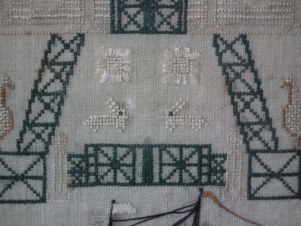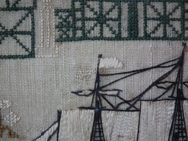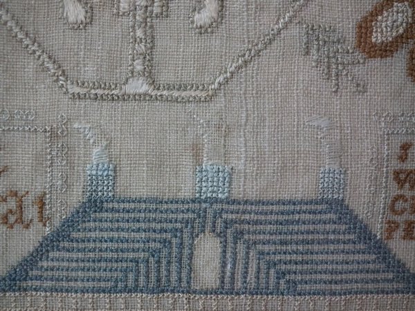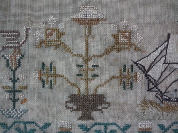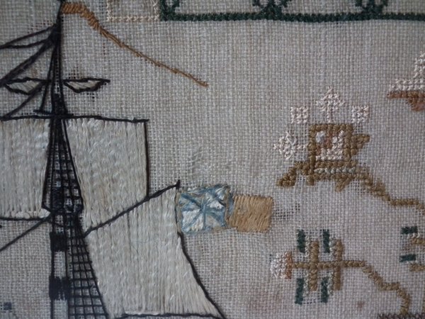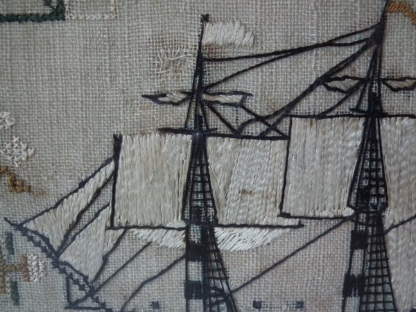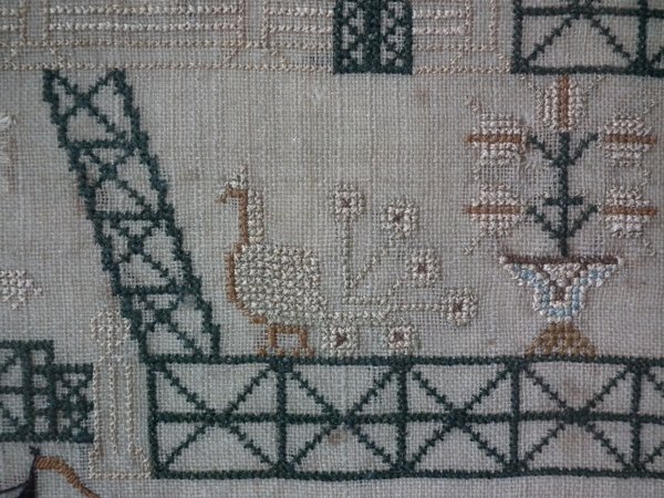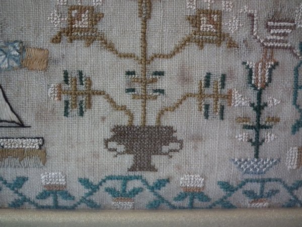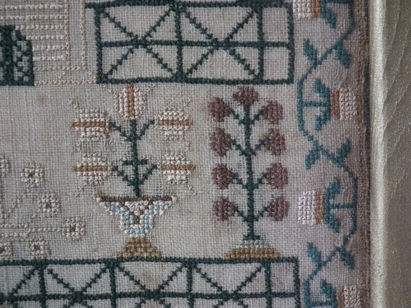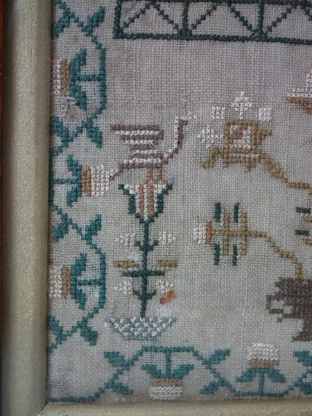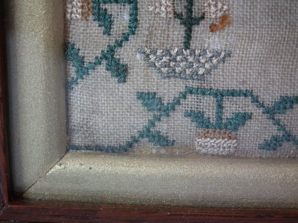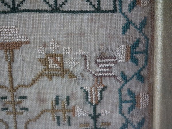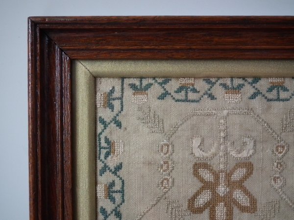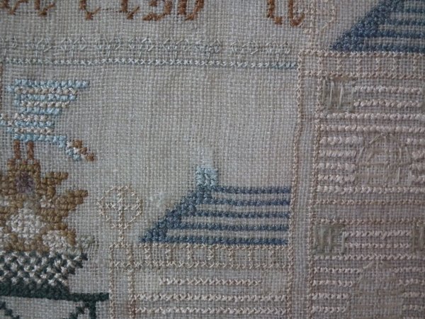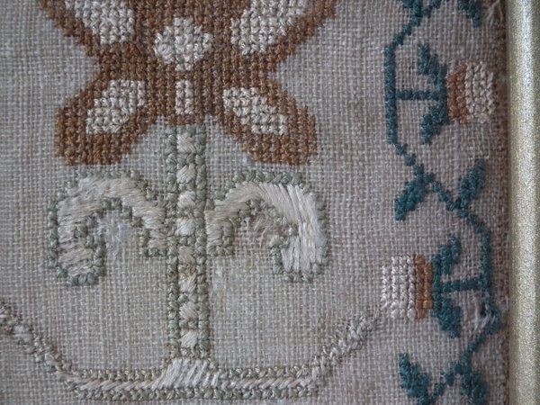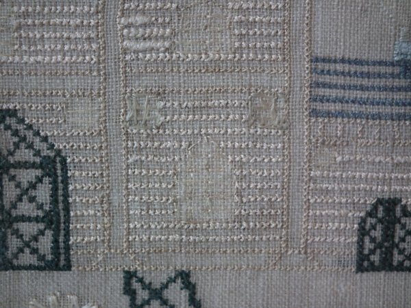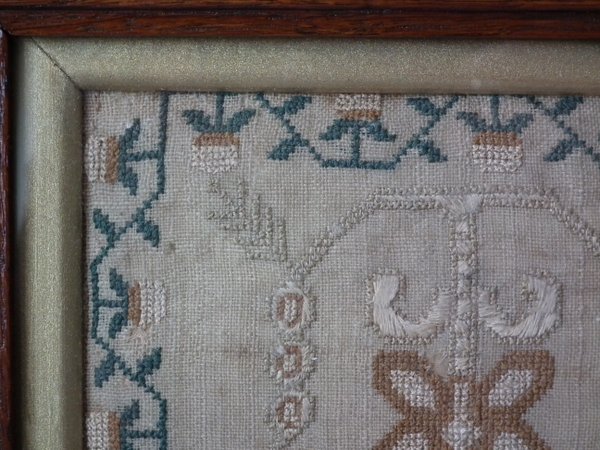 The sampler is worked in silk on linen ground, in a variety of stitches.