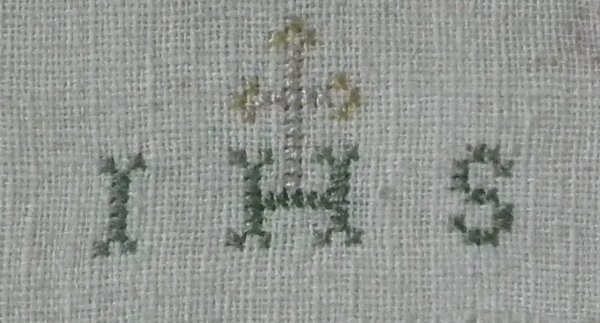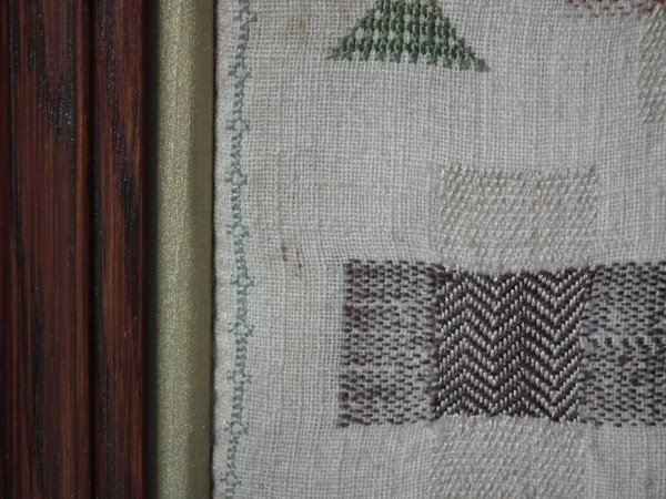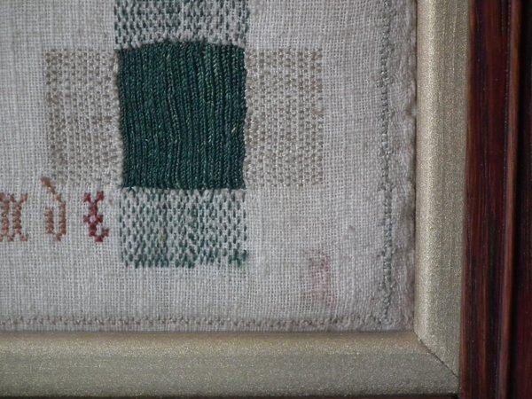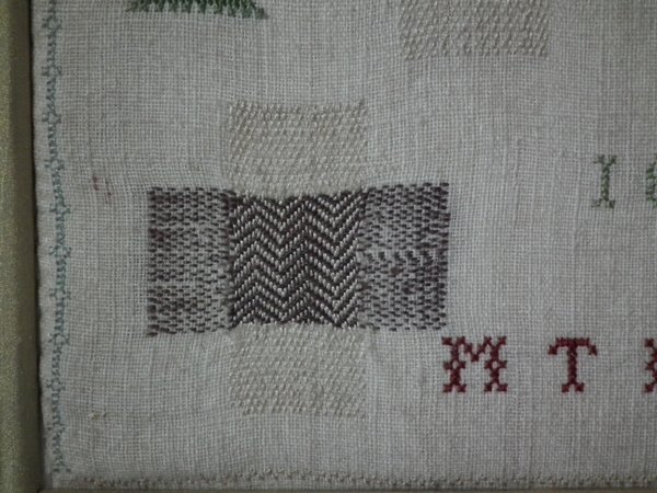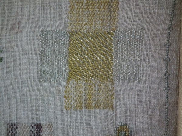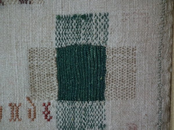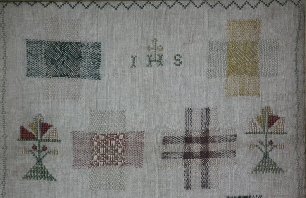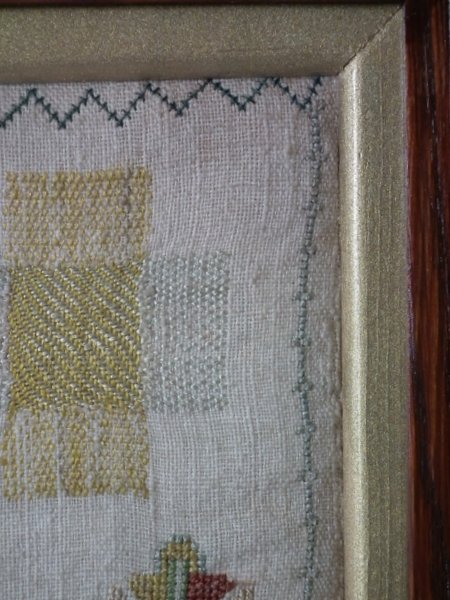 The sampler is worked in silk on linen ground, in a variety of stitches.
