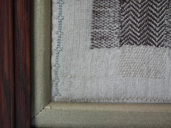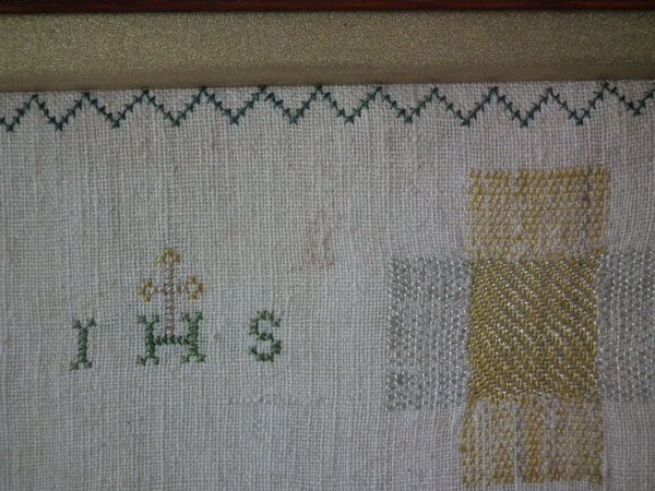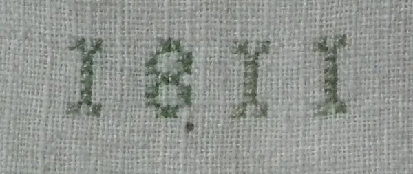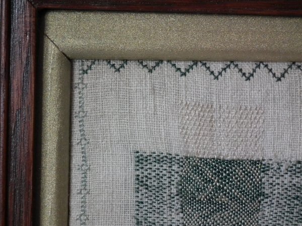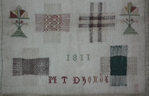 George III, dated 1811. 9ins by 9ins wide. Antique Darning Sampler, 1811, by I H S. Framed in an old wood frame with gilt slip and glass.