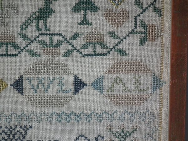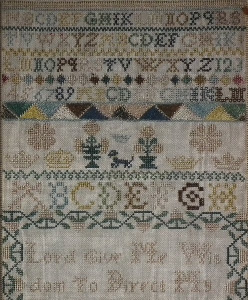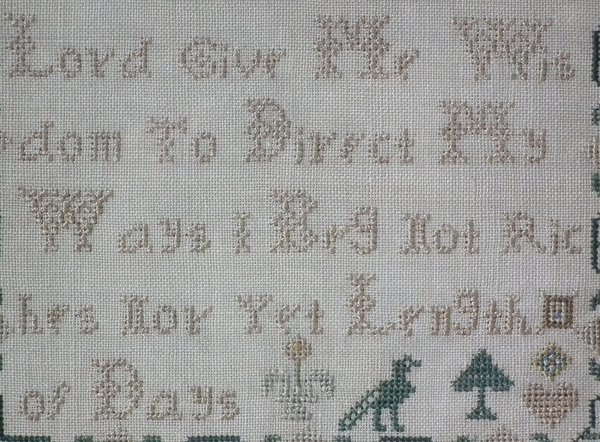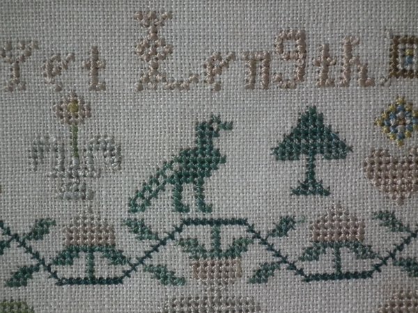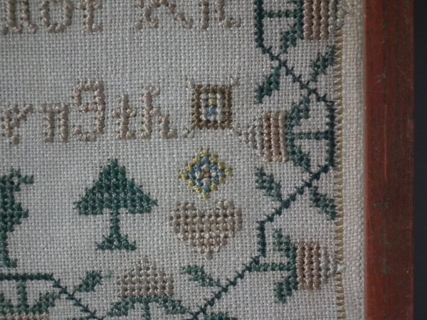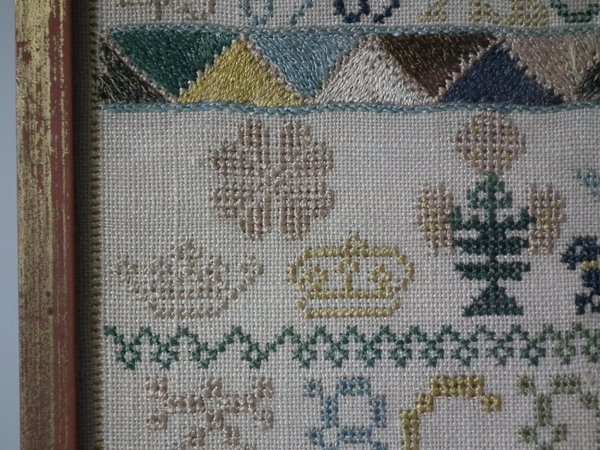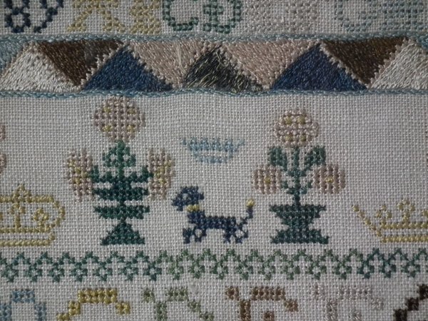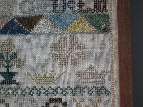 The sampler is worked in a silk-like thread on linen ground, in a variety of stitches including Algerian eye.