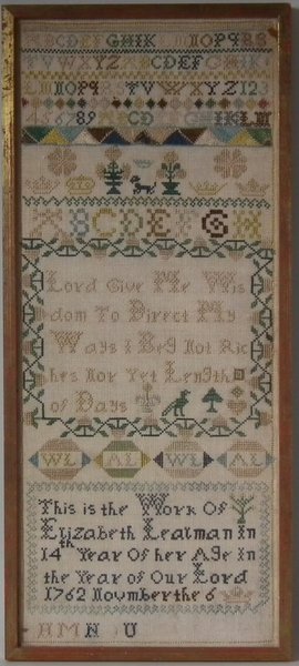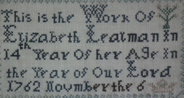 'This is the Work of Elizabeth Lealman In 14th Year Of her Age In the Year of Our Lord 1762 Novmber the 6'.