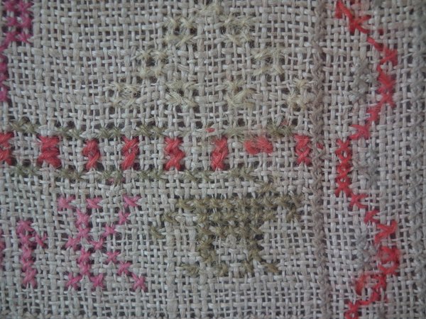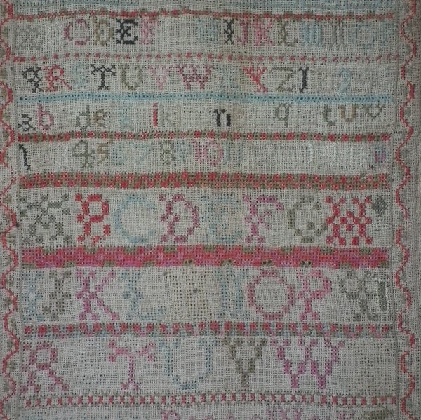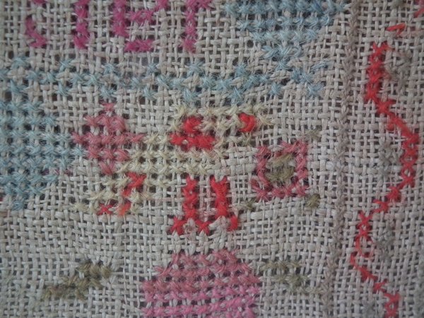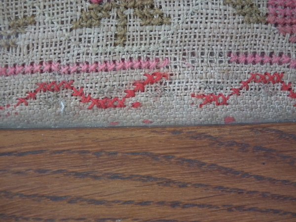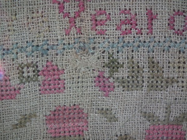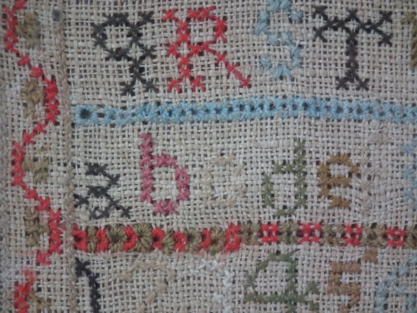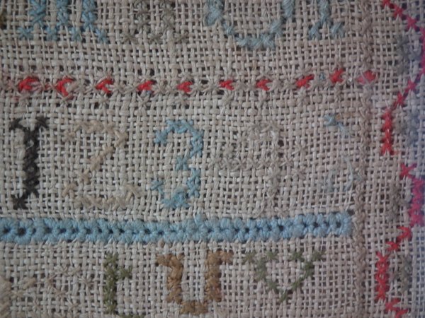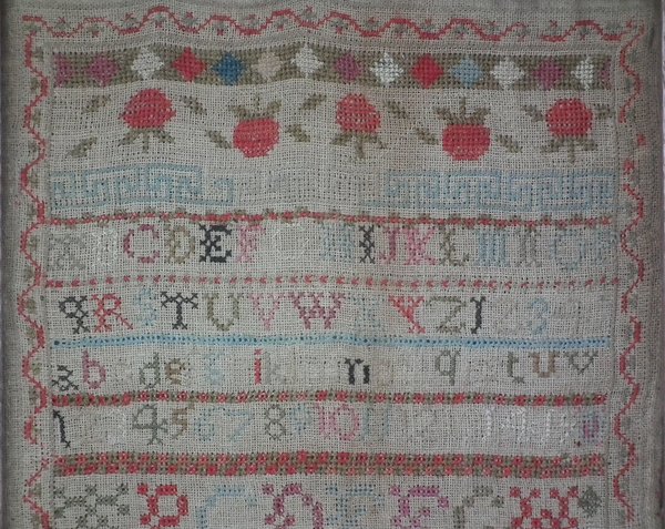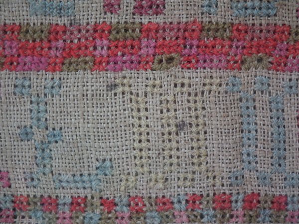 Some stitch losses to the border, divider lines, the signature, motifs and letters.