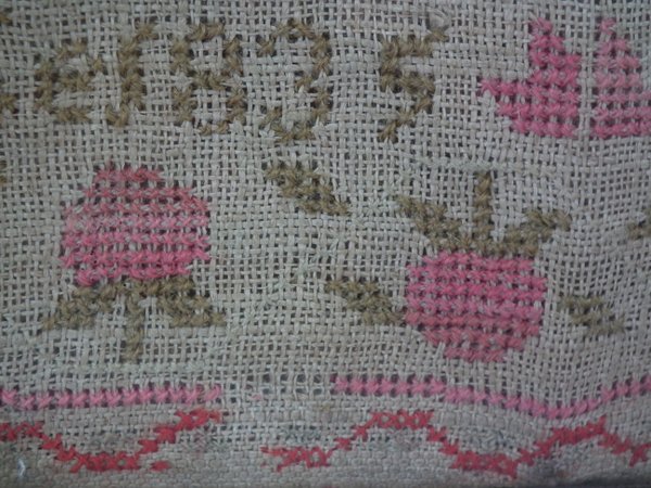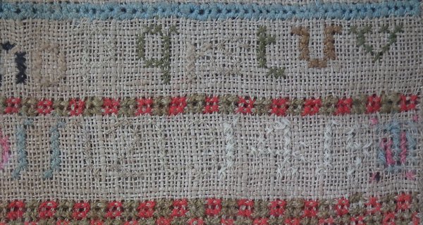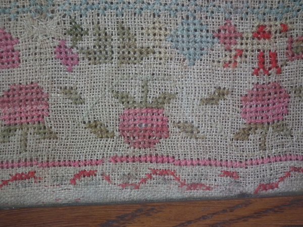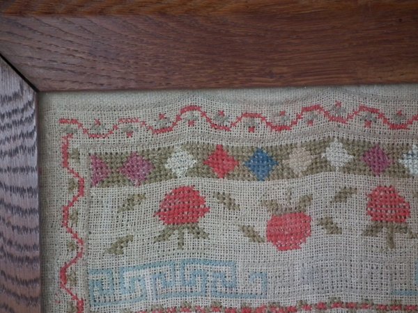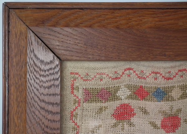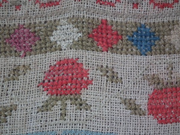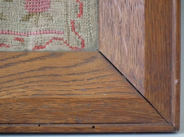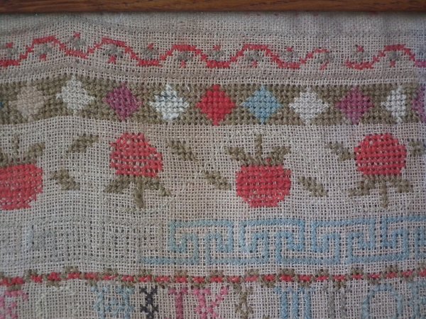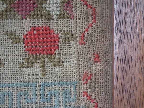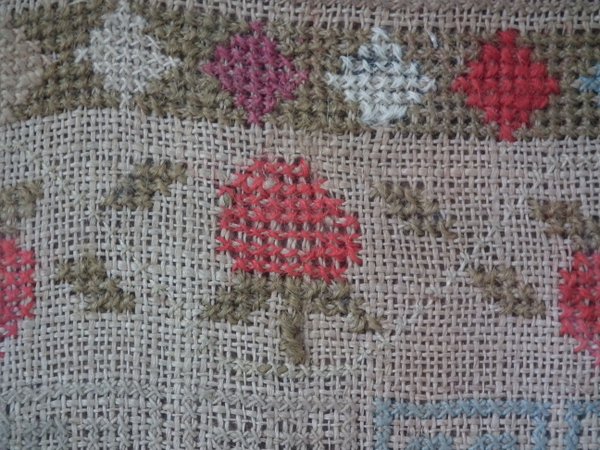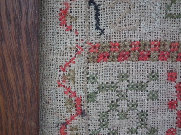 The sampler is worked in cotton and fine wool on canvas ground, in cross stitch throughout.