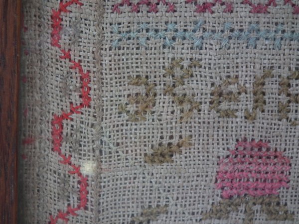 William IV, dated 1835. 16ins high by 9.75ins wide. 1835 Scottish Sampler by Margaret Rees. Framed in an old wood frame with rippled, old glass.