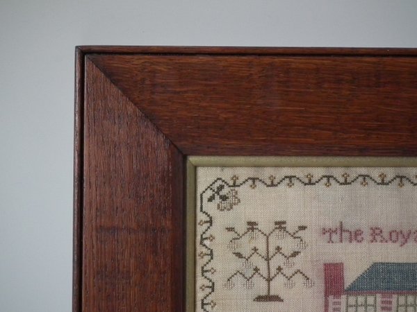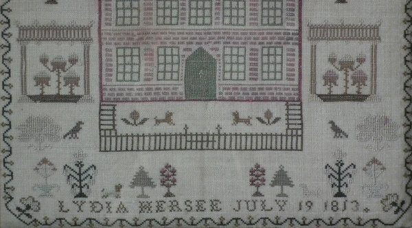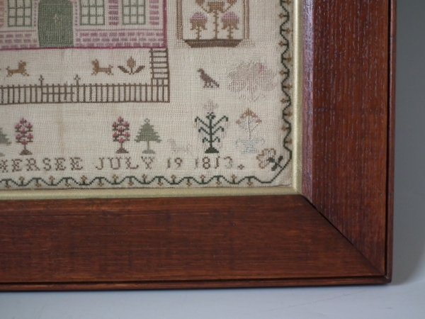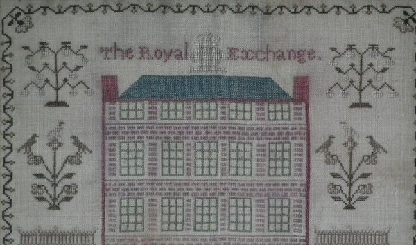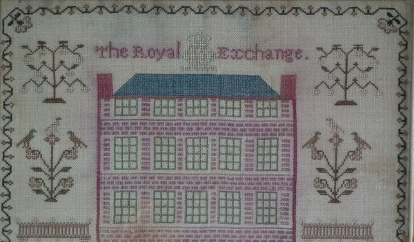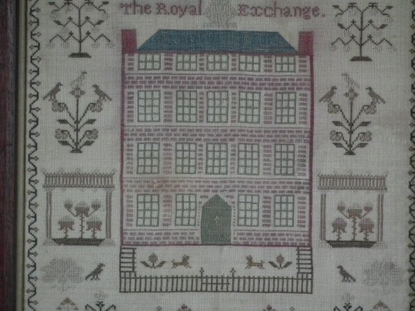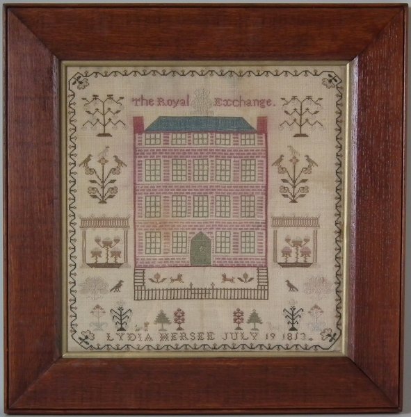 George III, dated 1813. 13ins by 13ins wide. 1813 'Royal Exchange' Sampler by Lydia Hersee. Framed in an old wood frame with gilt slip and glass.