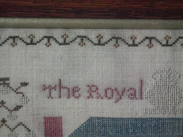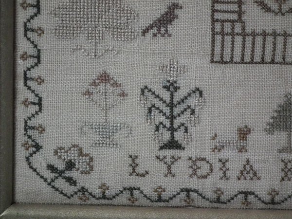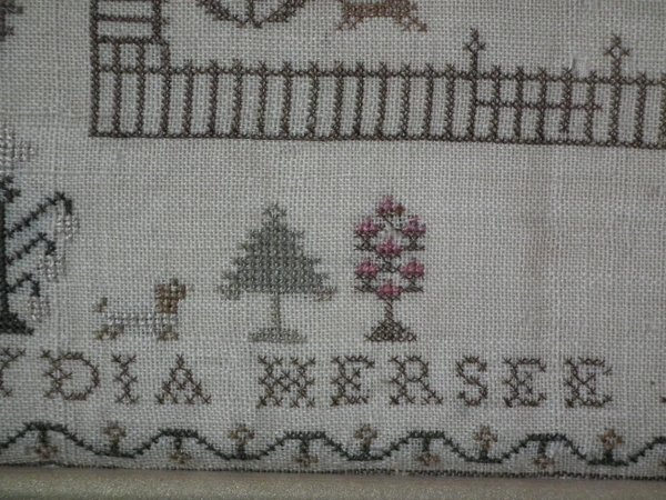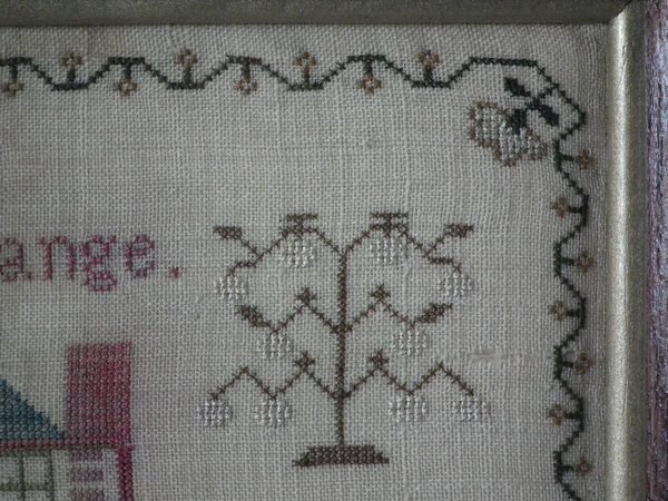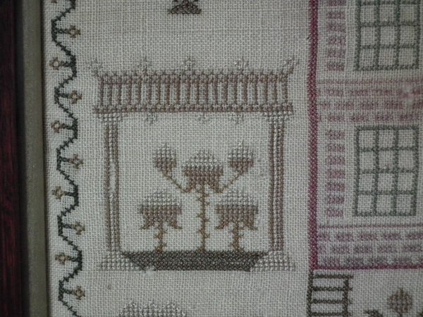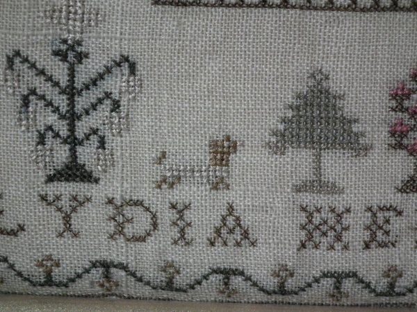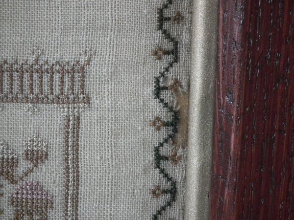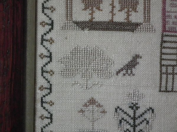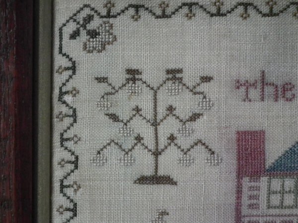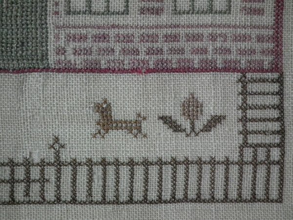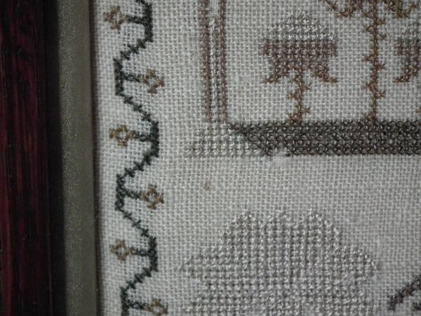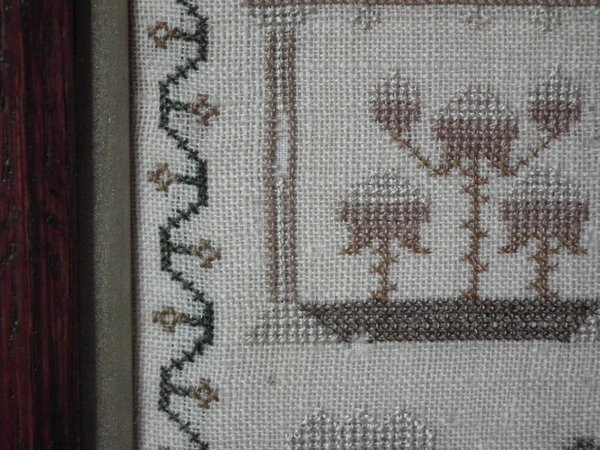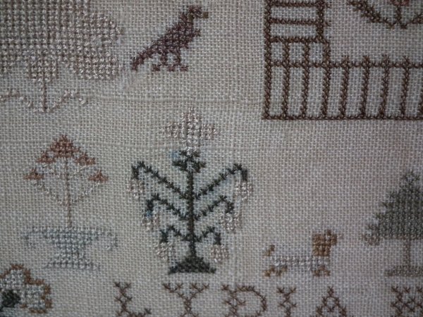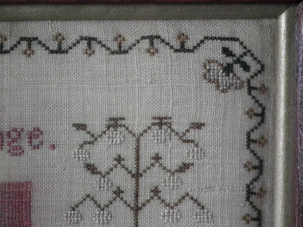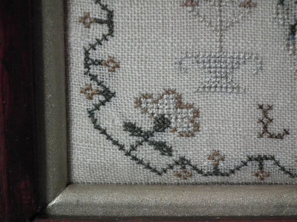 The sampler is worked in silk on linen ground, in cross stitch throughout.