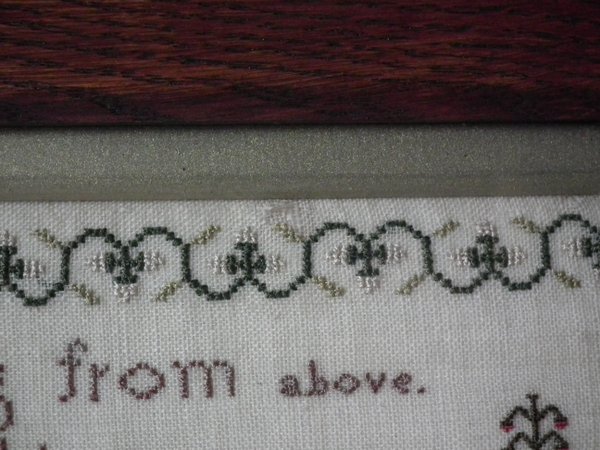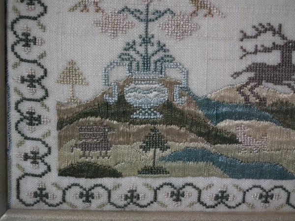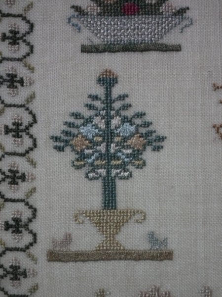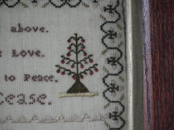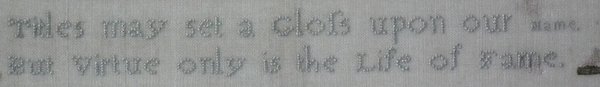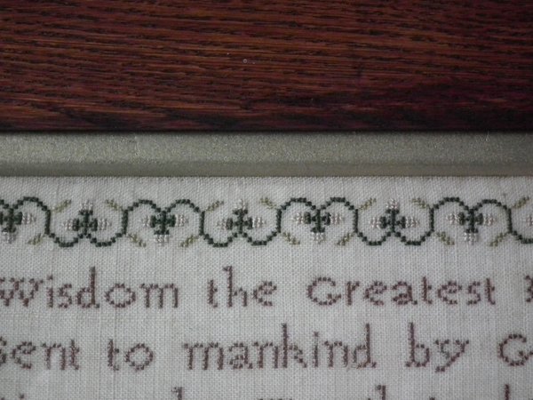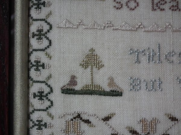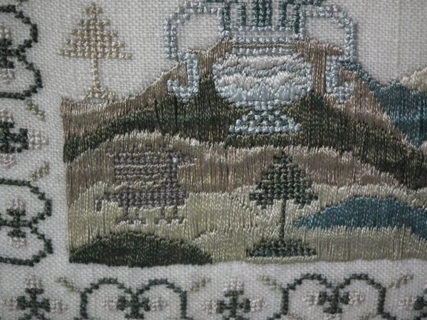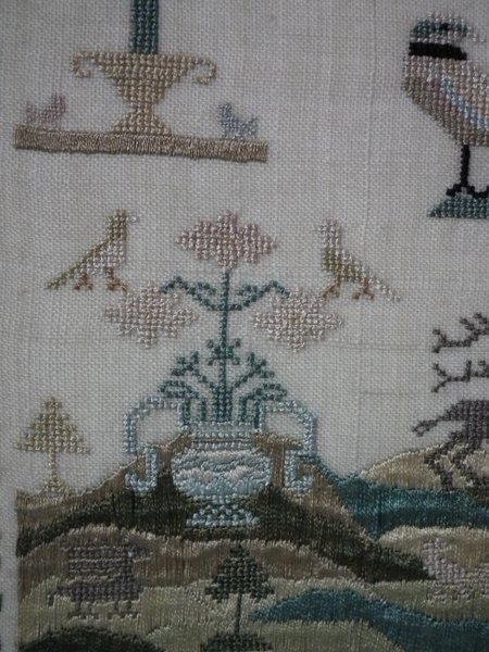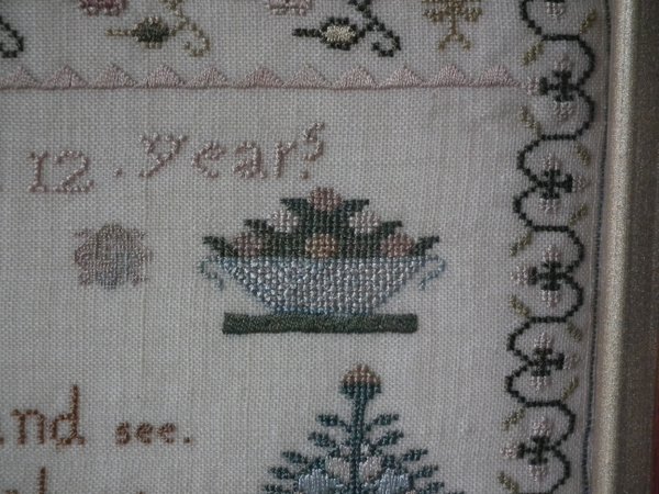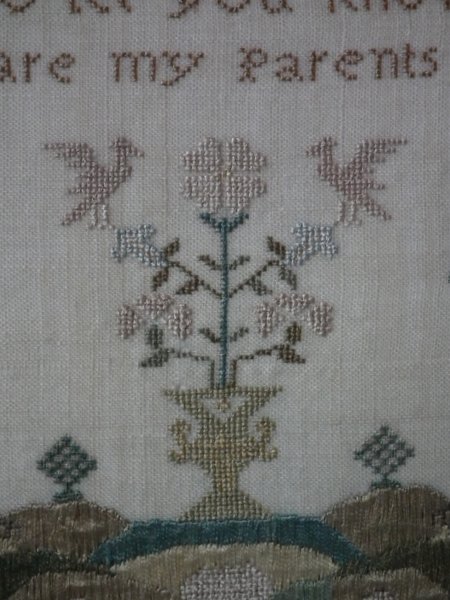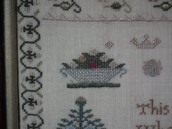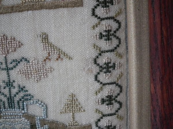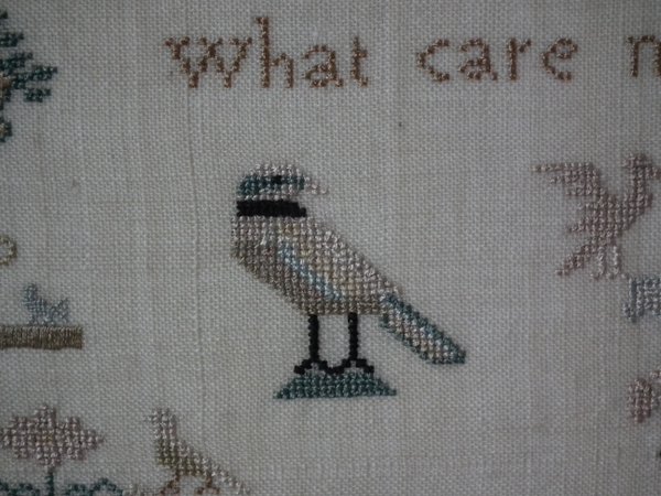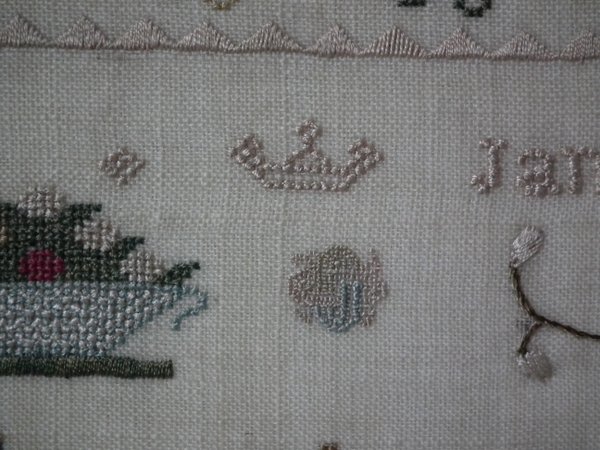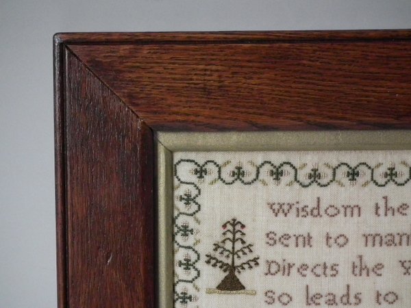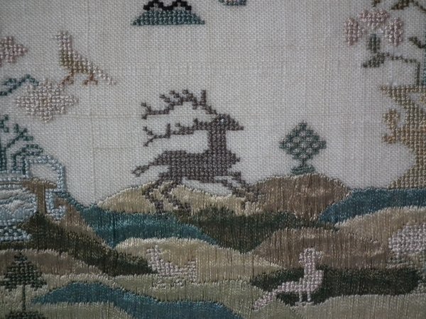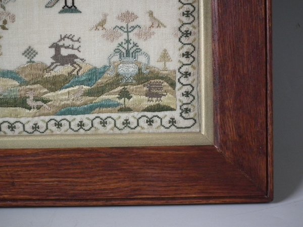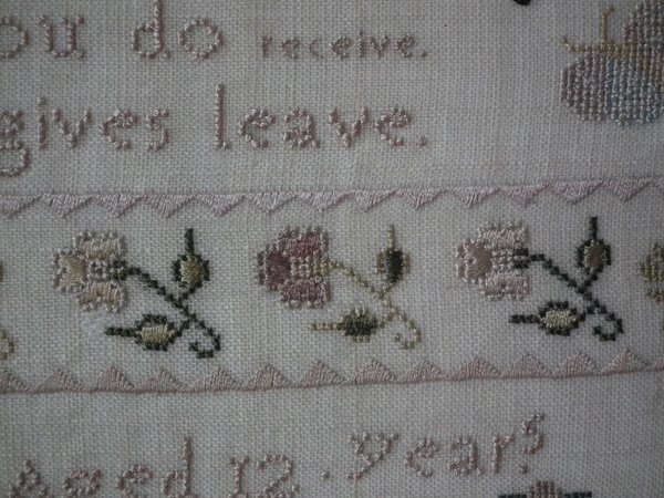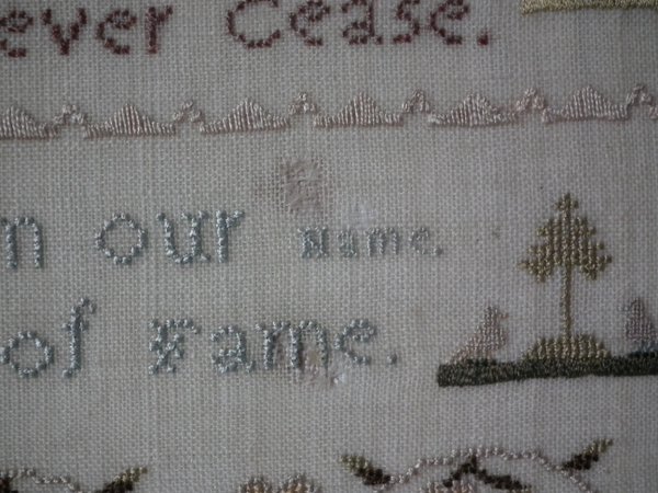 The sampler is worked in silk on linen ground, in a variety of stitches.