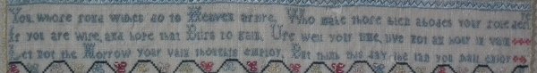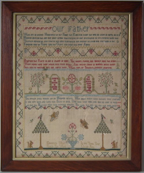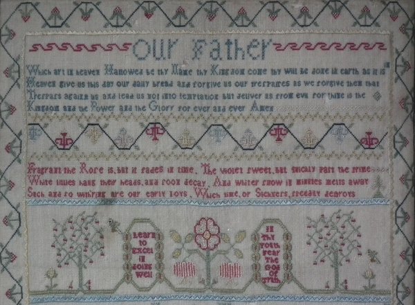 George III, circa 1800. 15.75ins by 12.5ins wide. Religious verse sampler by Elizabeth West.