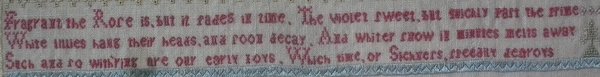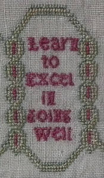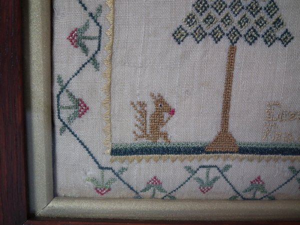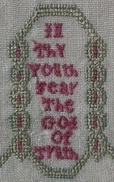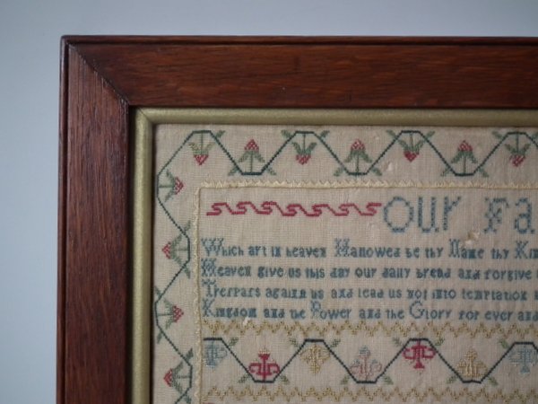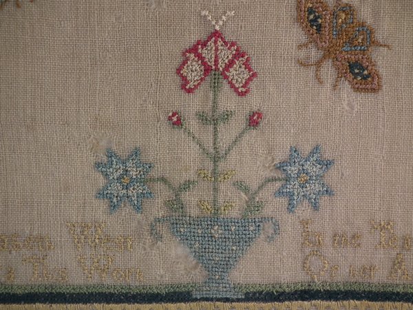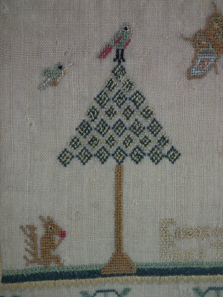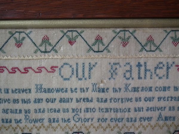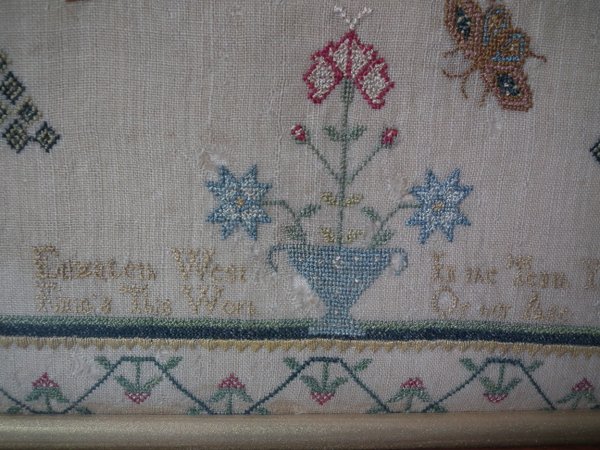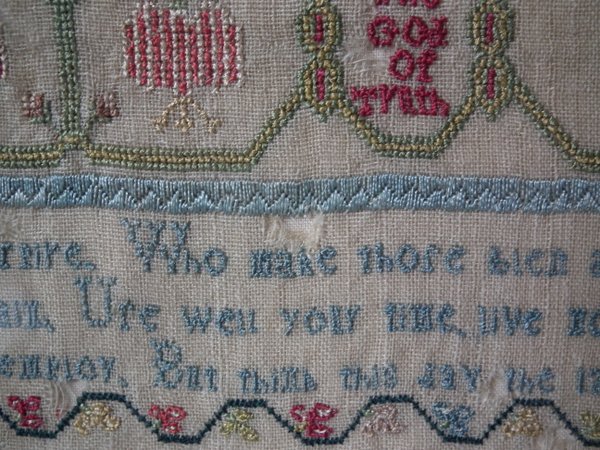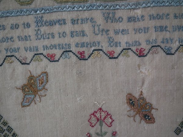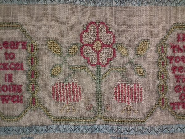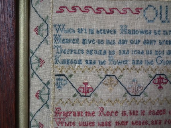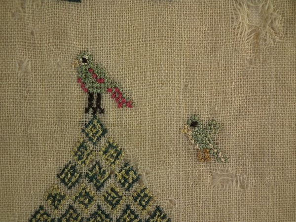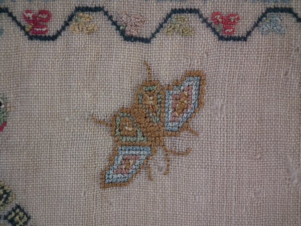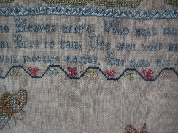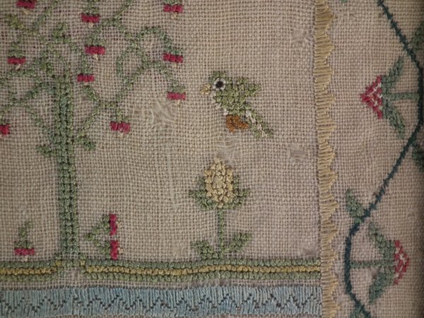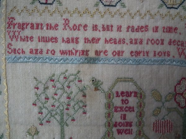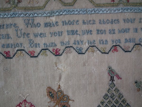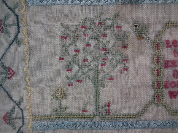 The sampler is worked in silk on linen ground, in a variety of stitches including Algerian eye.