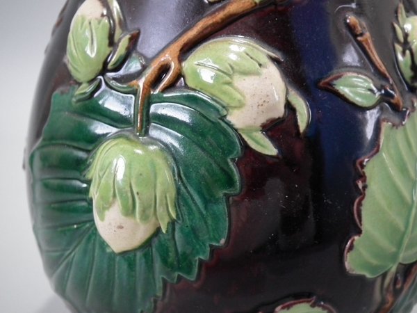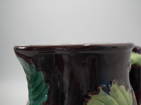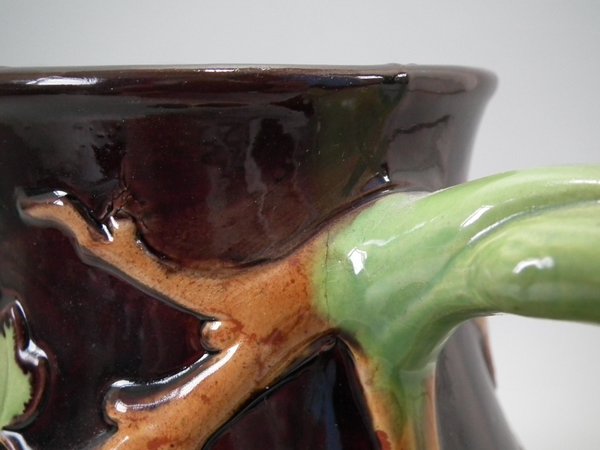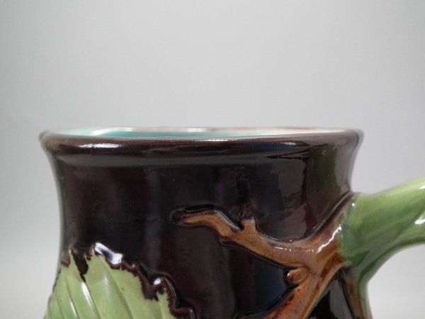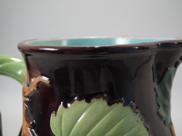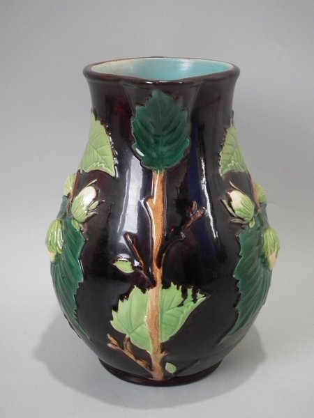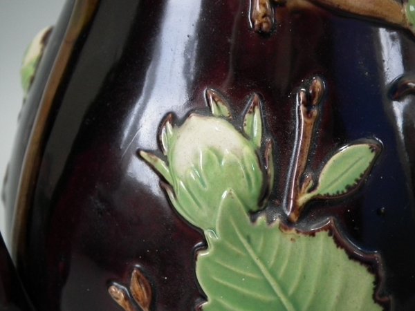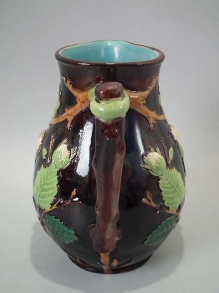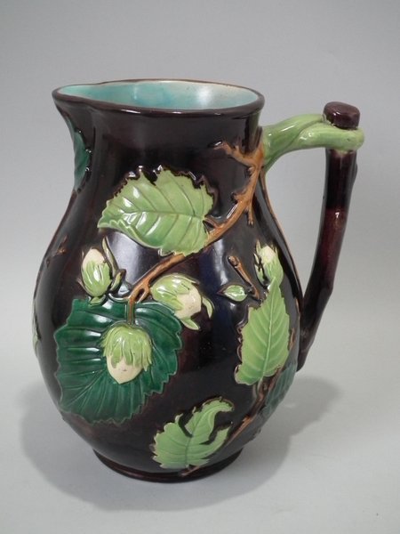 Victorian, circa 1880. 7.9ins high, 6.3ins wide, 5.5ins depth. Unidentified English Majolica jug/pitcher which features sprigs of hazelnut buds and leaves. Colouration: brown, green, white, are predominant.