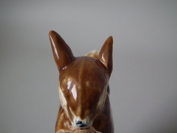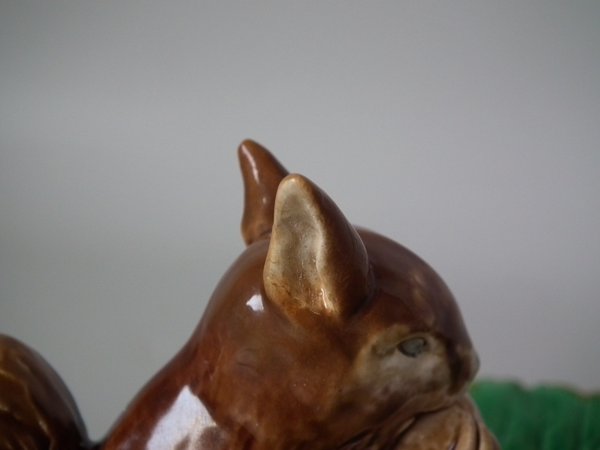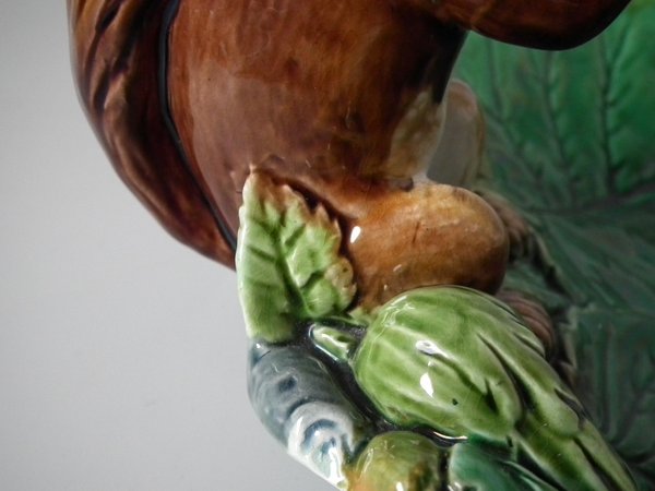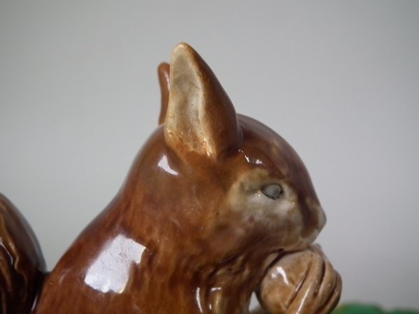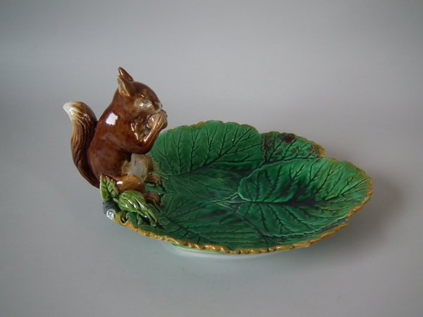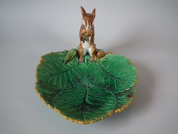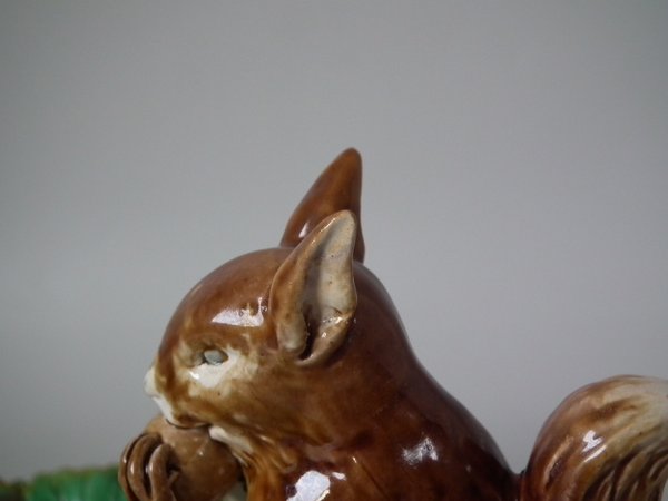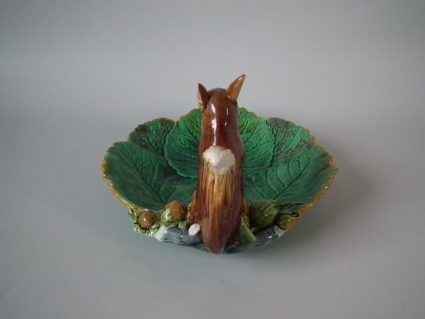 Victorian, circa 1870. 5.2ins high, 9.8ins wide, 7.2ins depth. Minton Majolica nut dish which features a squirrel holding a nut. Colouration: green, brown, ochre, are predominant.