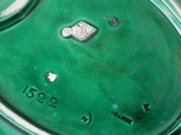 The piece bears maker's marks for the Minton pottery. Bears a pattern number, '1522'. English diamond registration mark for the date 23/07/1869. Marks include a factory specific date cipher for the year 1870.