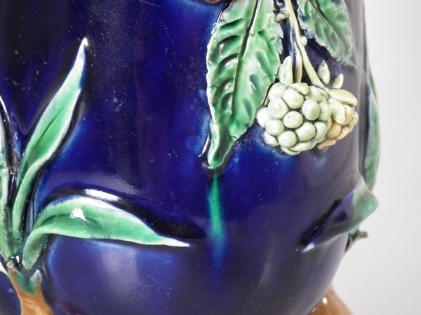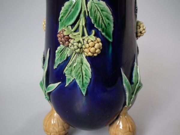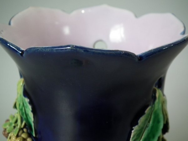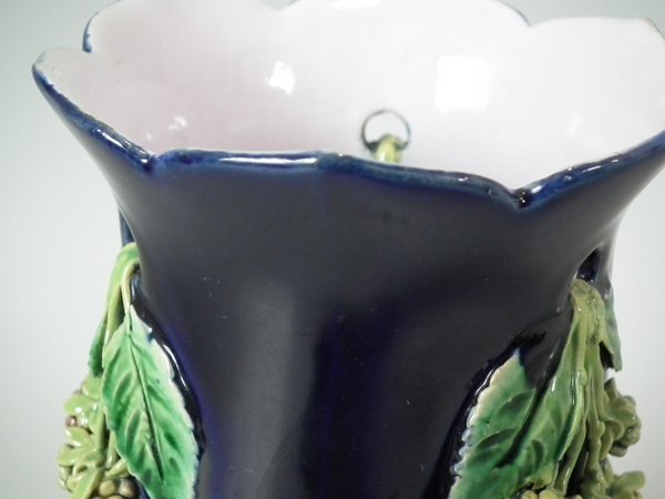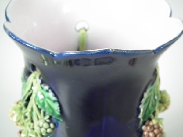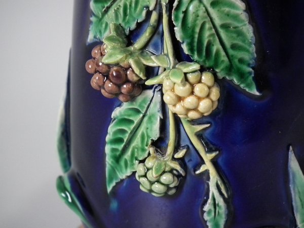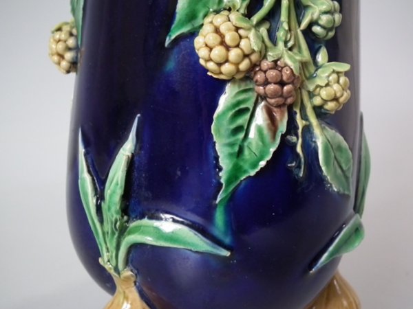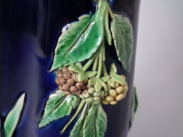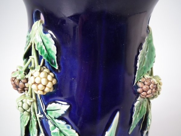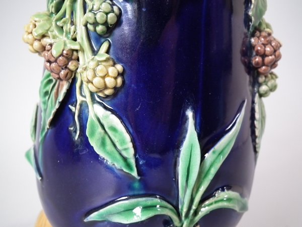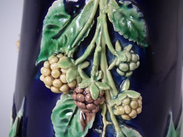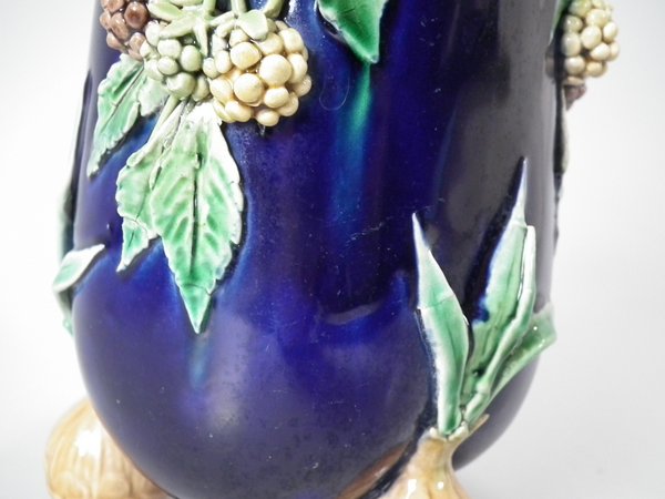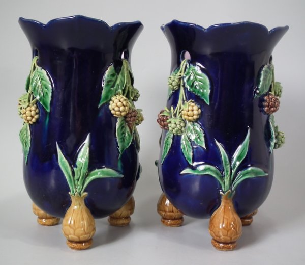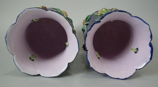 Pair of Minton Majolica vases which feature blackberry fruits and leaves, unusually modelled hanging through a hole in the side of the vase.