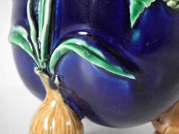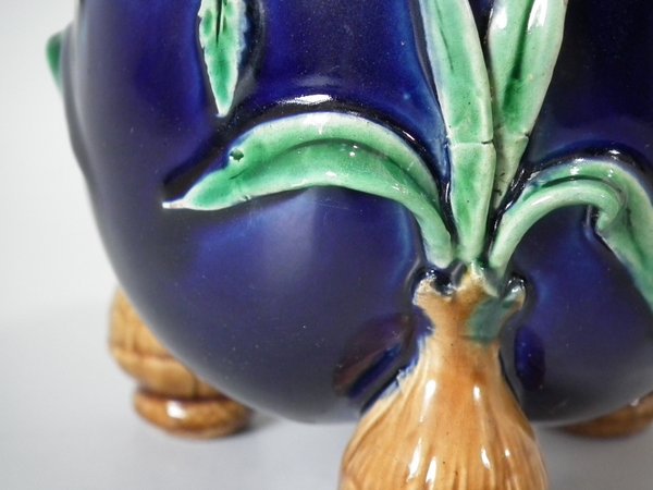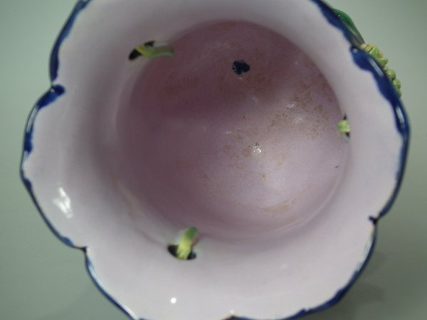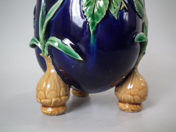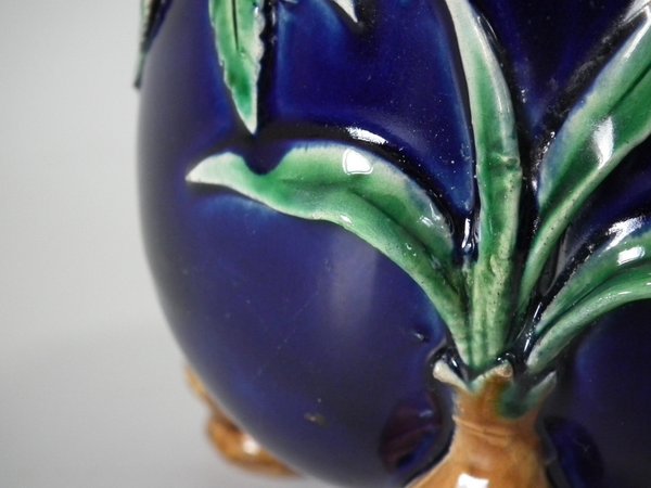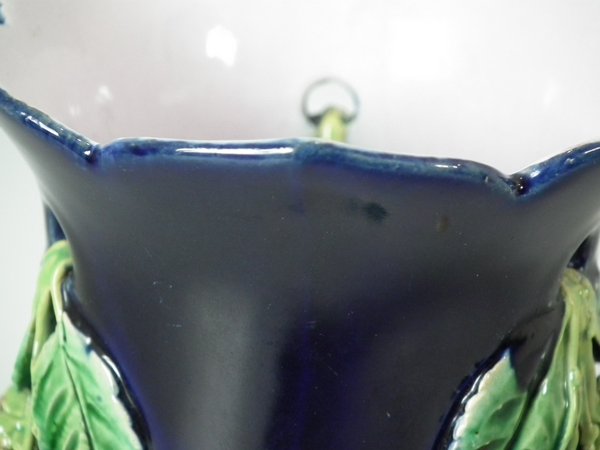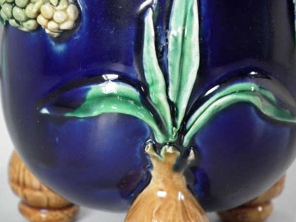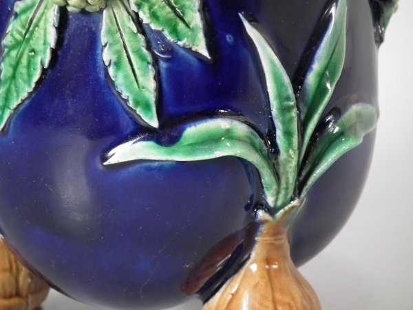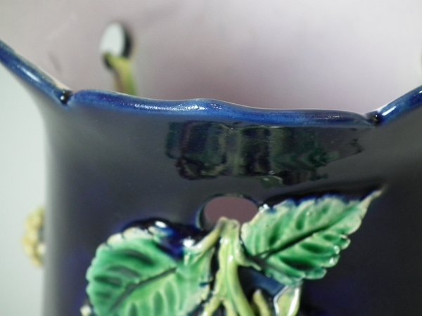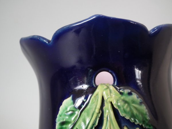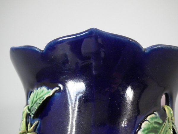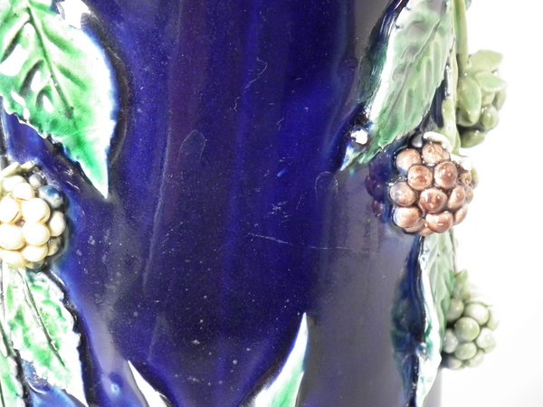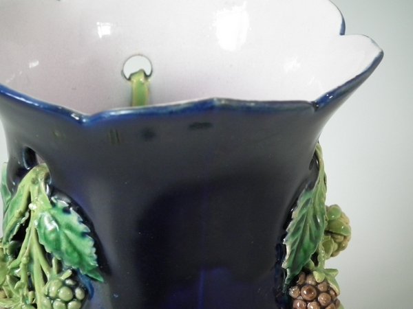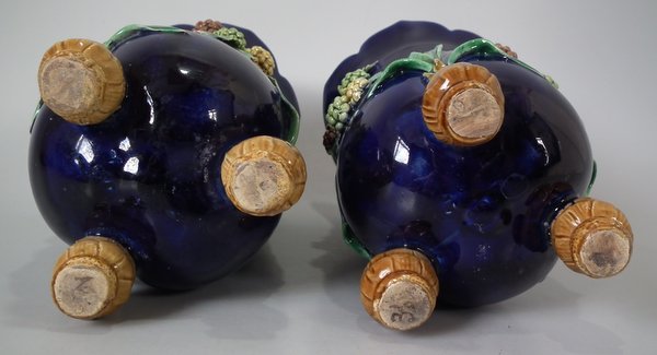 Pair of Minton Majolica vases which feature blackberry fruits and leaves, unusually modelled hanging through a hole in the side of the vase.