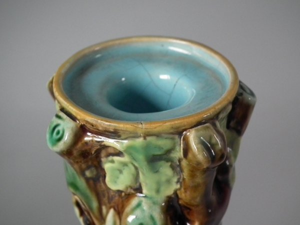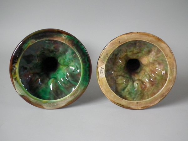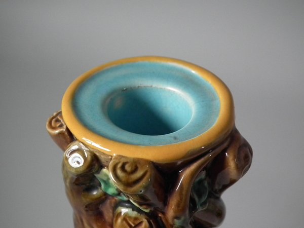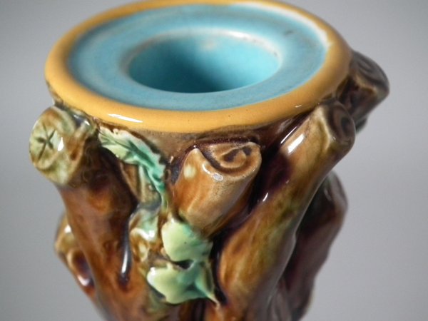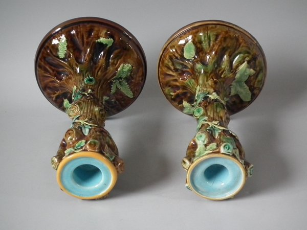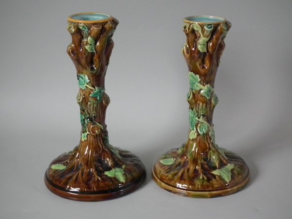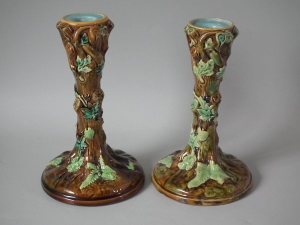 Victorian, circa 1870. Tallest is 7.9ins high, 4.8ins wide, 4.8ins depth. Pair of George Jones & Sons Majolica candlestick holders