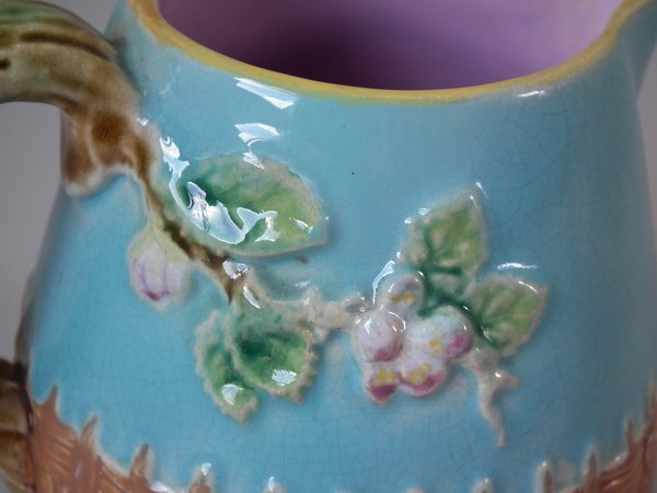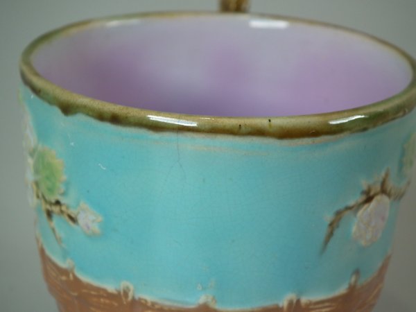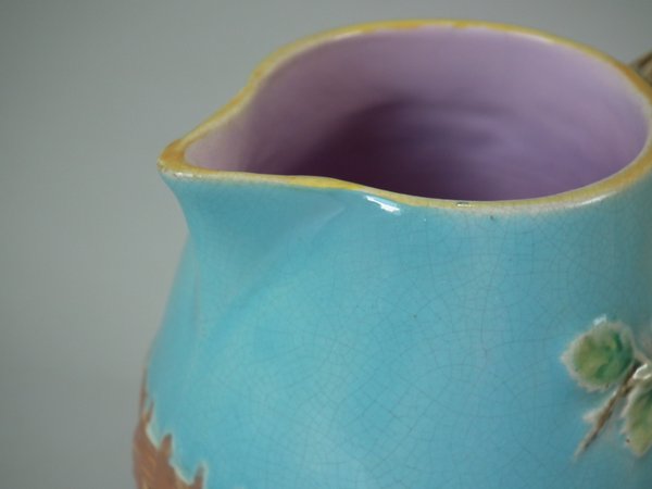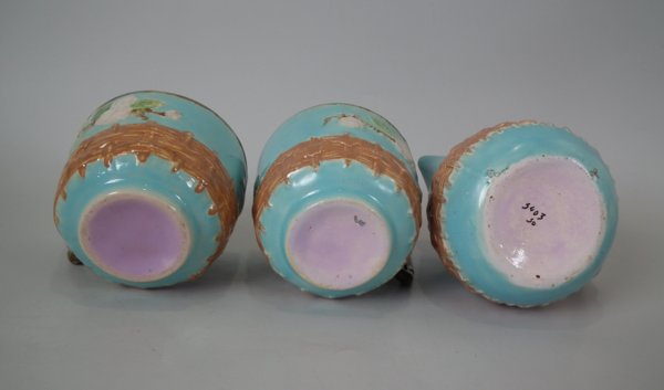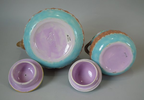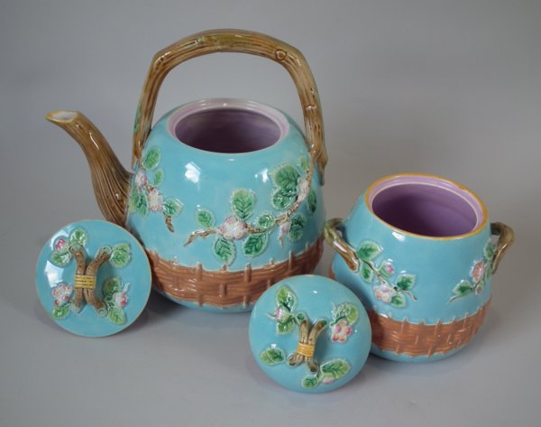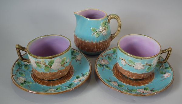 George Jones Majolica tea set, consisting of: a teapot, sugar bowl with cover, milk jug, two cups and saucers and a tray.