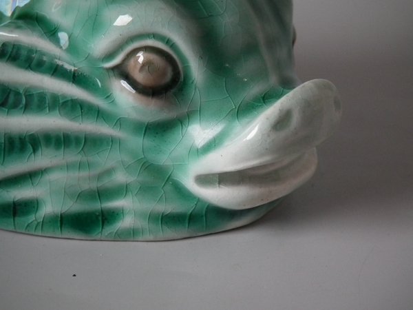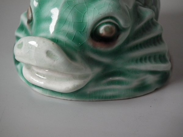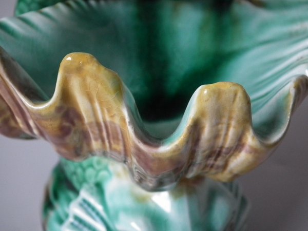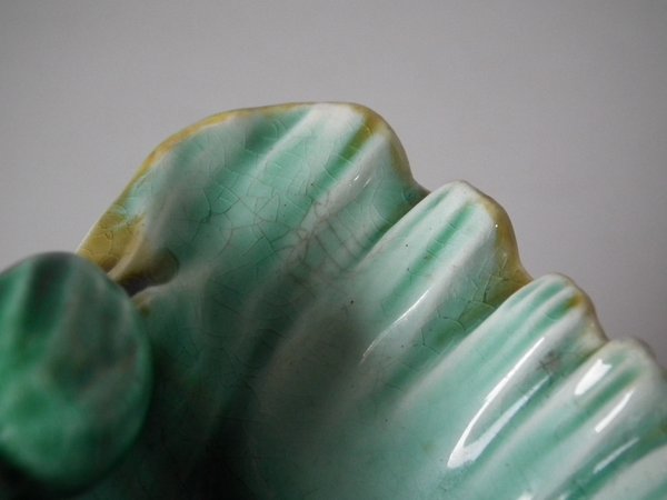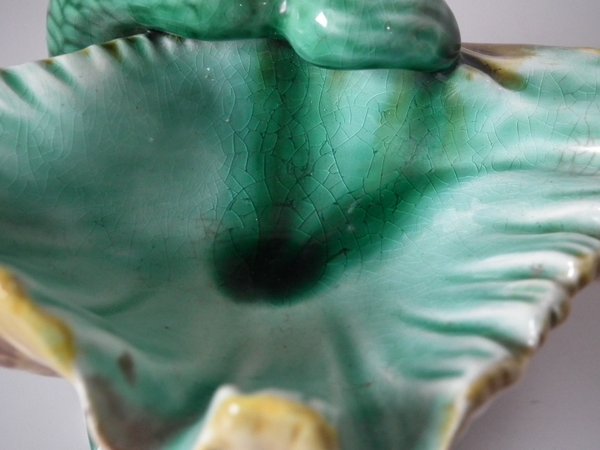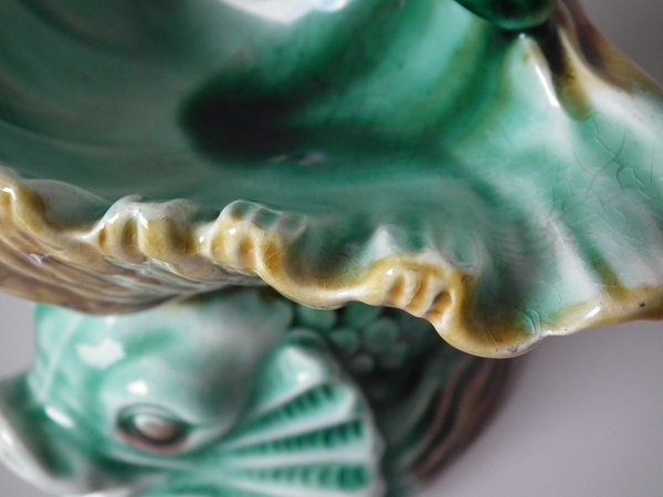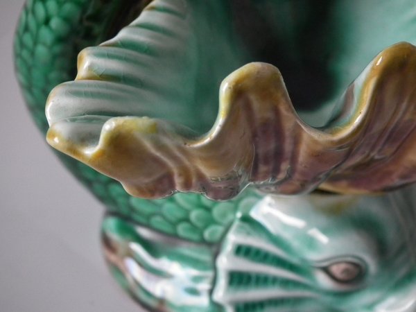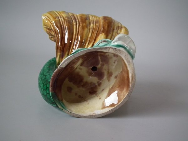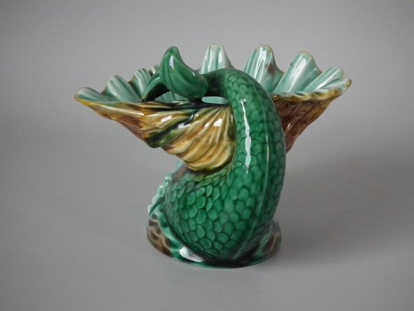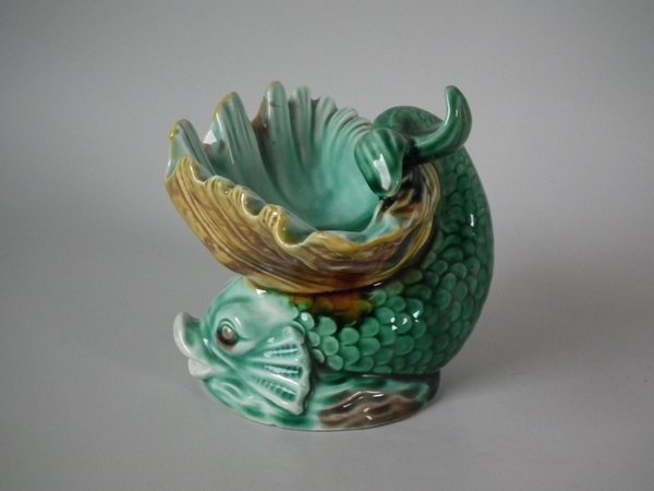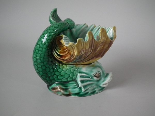 Victorian, circa 1889. 4.7ins high, 6ins wide, 4.7ins depth. Wedgwood Majolica salt which features a dolphin holding a shell with it's tail.