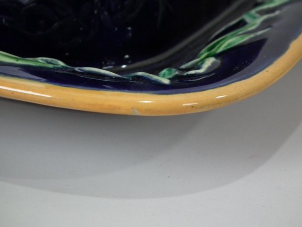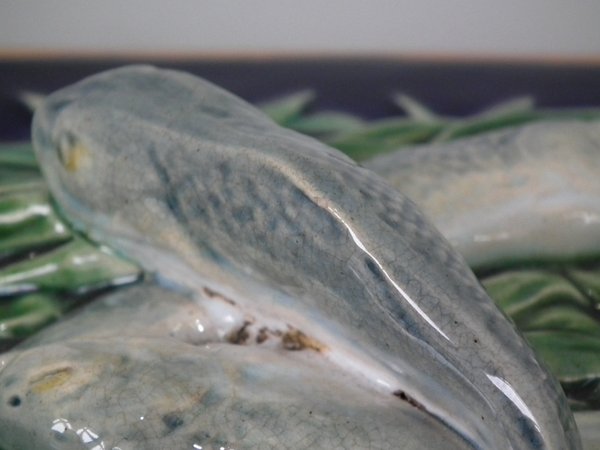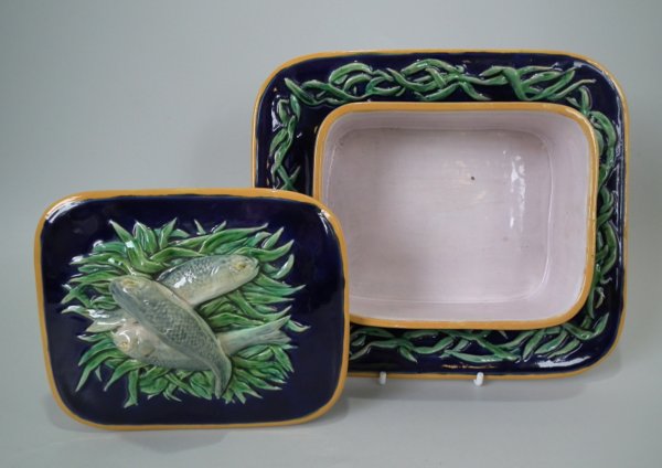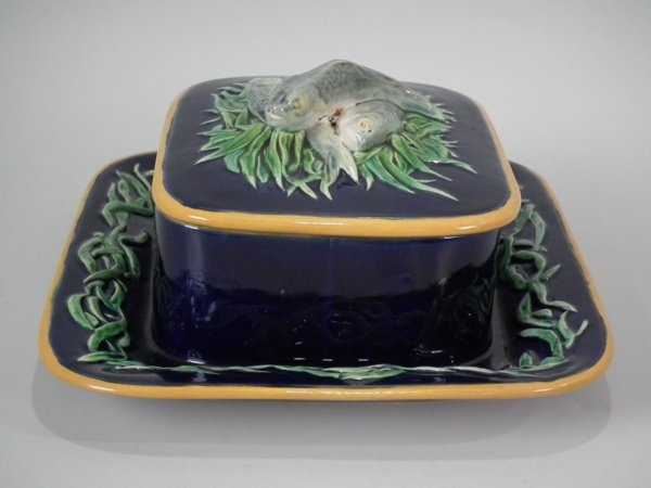Minton Majolica sardine box which features three fish lying on a bed of seaweed.