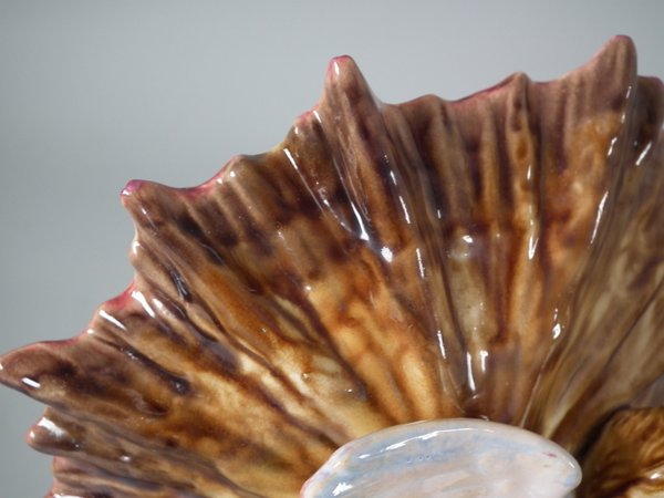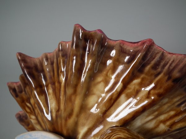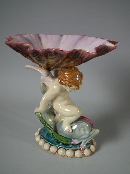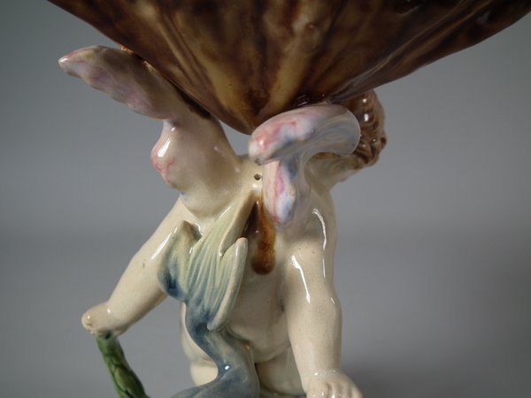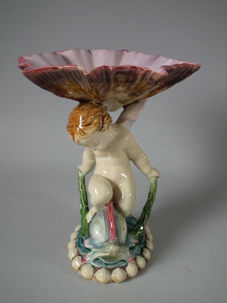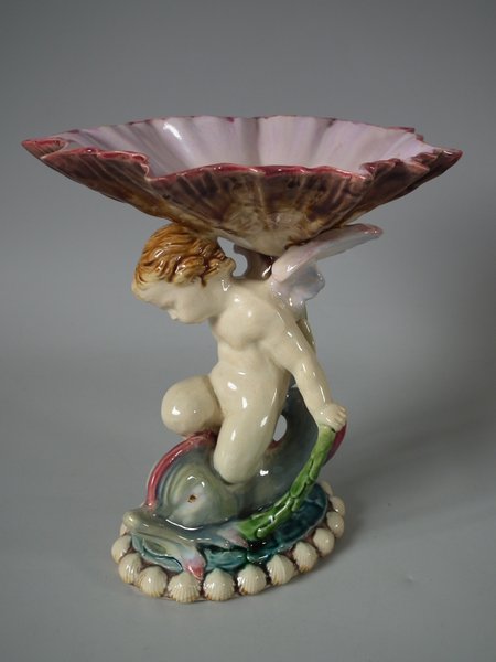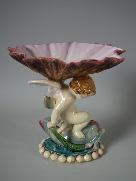 Victorian, circa 1903. 7.2ins high, 6.9ins wide, 6.3ins depth. Minton Majolica serving dish which features a putti riding a cherub, with a shell resting on it's wings.