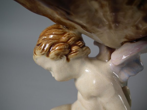 faint, over glazed shrinkage line to the putti's right shoulder.