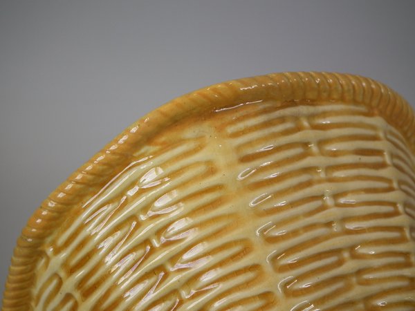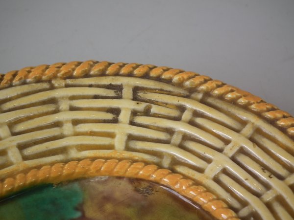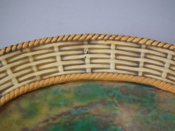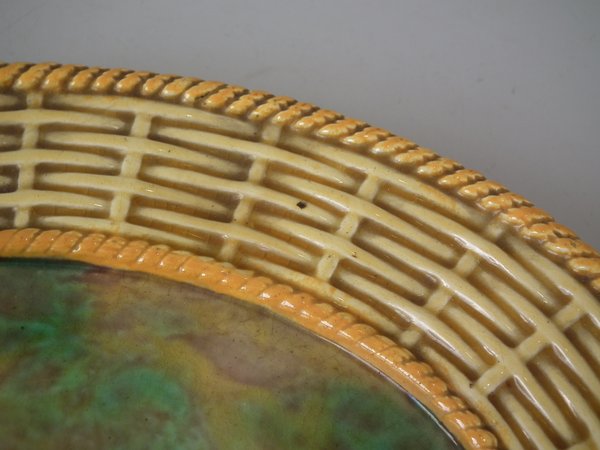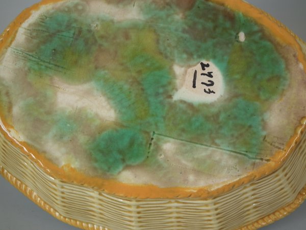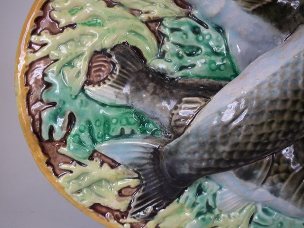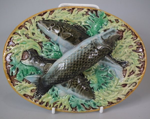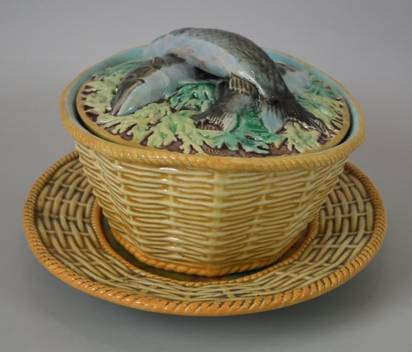 George Jones Majolica sardine box which features fish lying on a bed of seaweed.