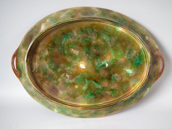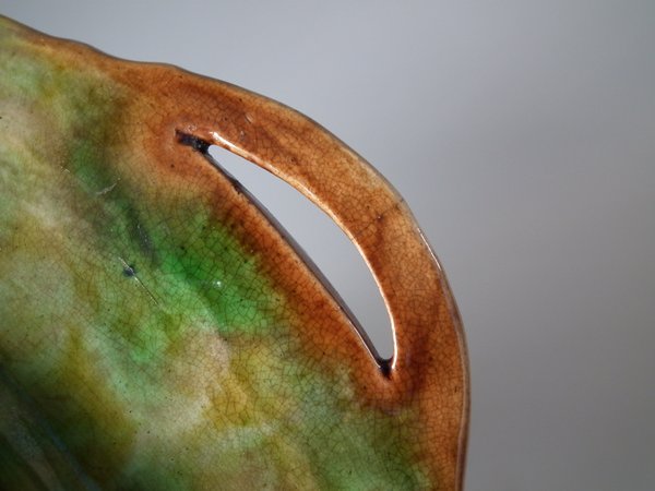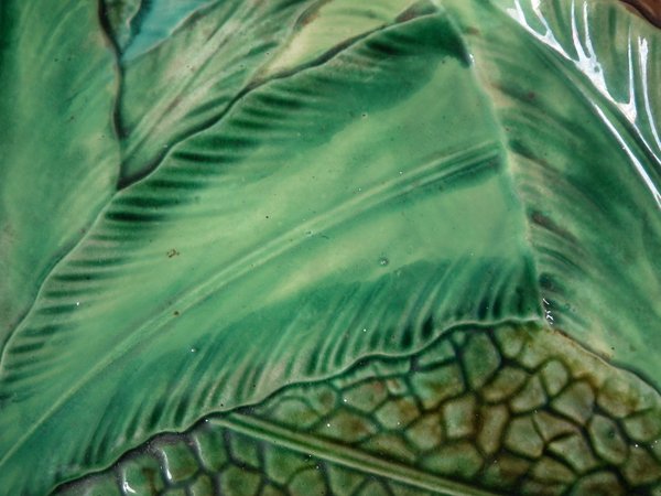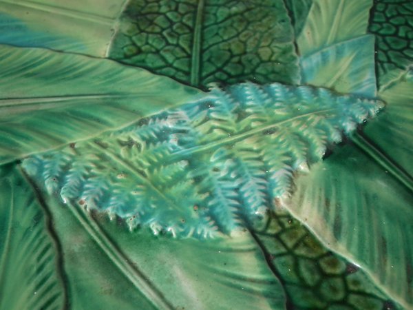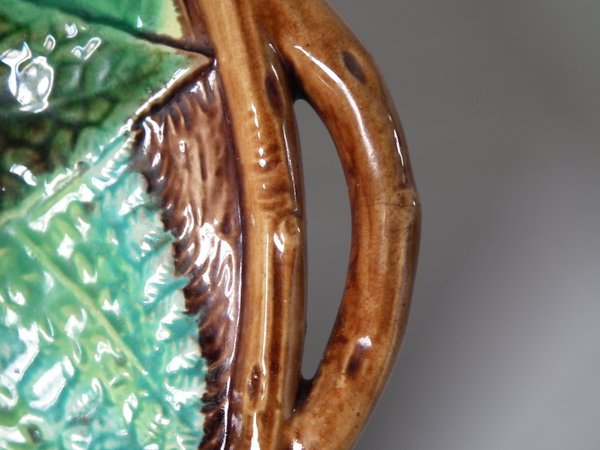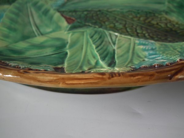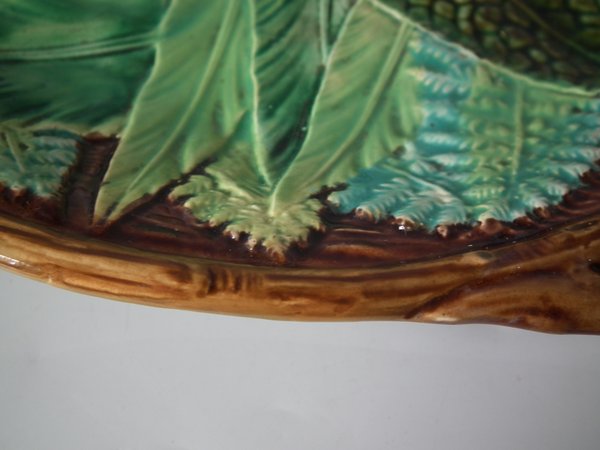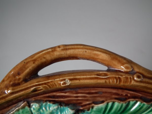Victorian, circa 1870. 11.8ins high, 15.7ins wide, 1.8ins depth. George Jones Majolica platter which features ferns and leaves with twig handles.