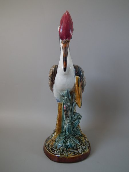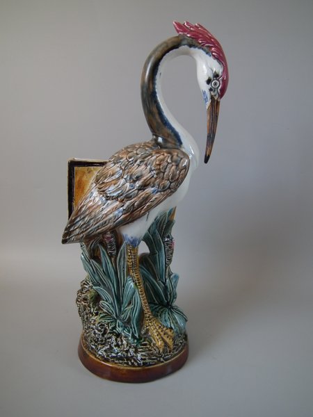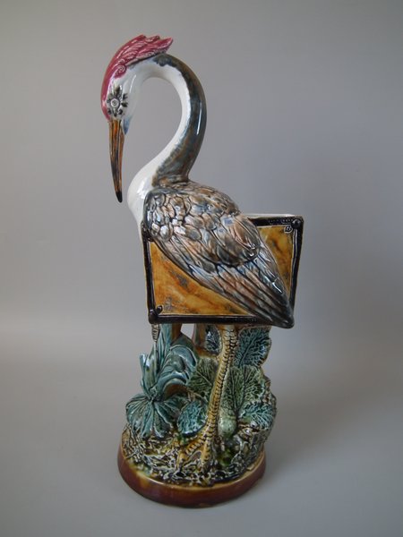 Victorian, circa 1890. 17.7ins high, 6.7ins wide, 6.7ins depth. Majolica vase which features a heron-like bird, carrying a book under it's wing.