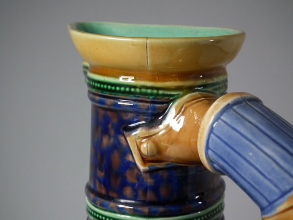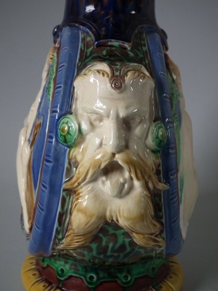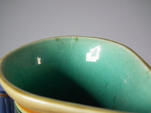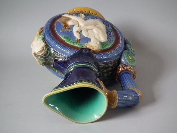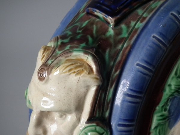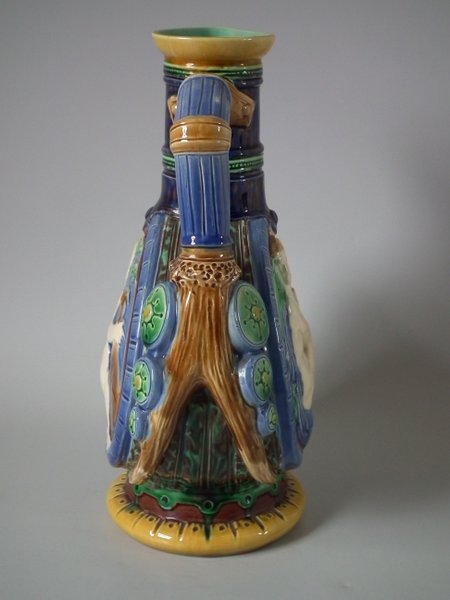 Victorian, circa 1863. 11.4ins high, 7.9ins wide, 4.7ins depth. Minton Majolica jug/pitcher which features circular panels to the sides, depicting classical figures with dogs.