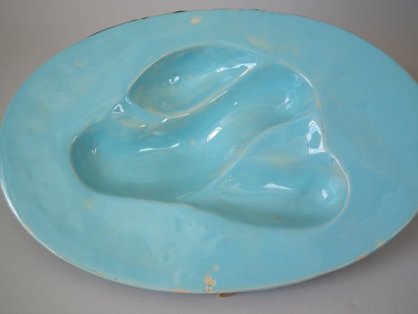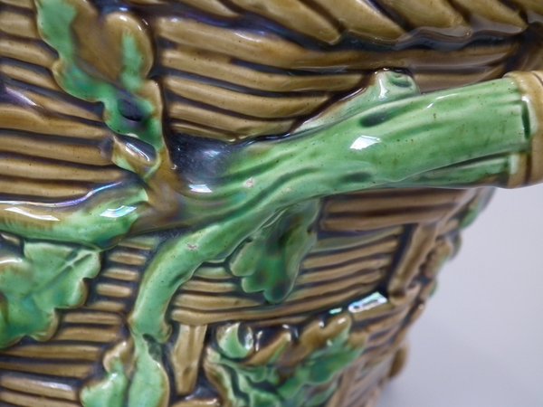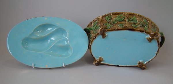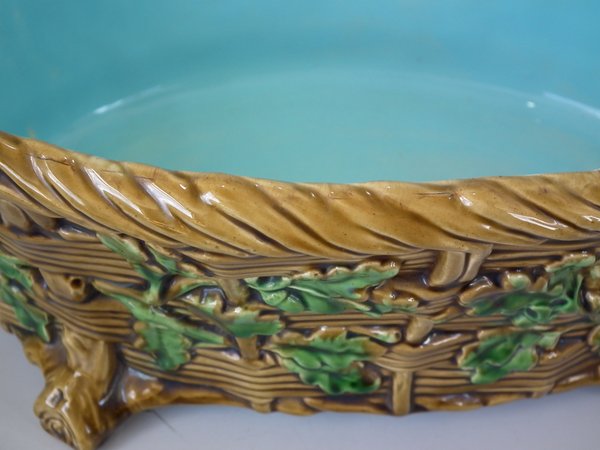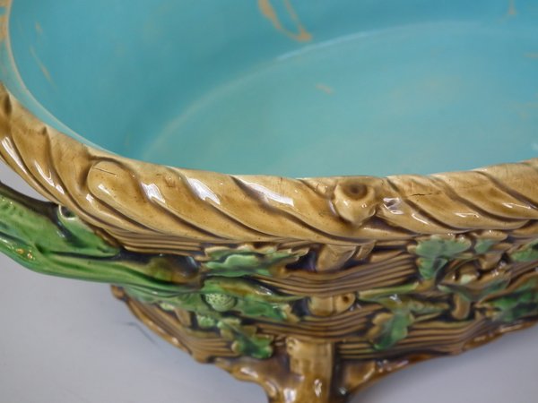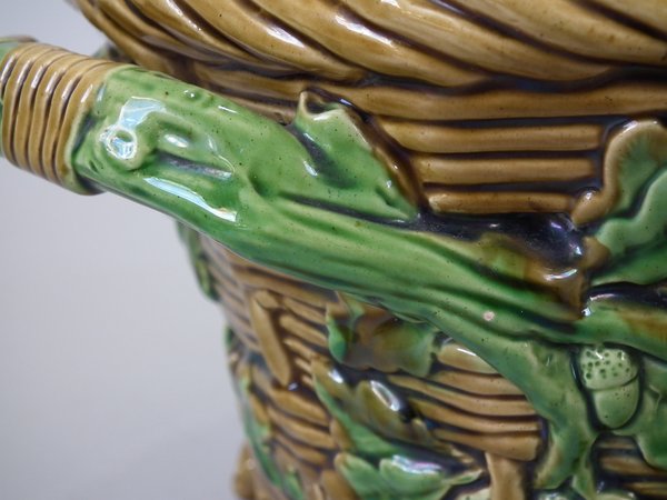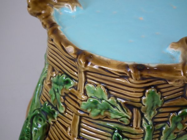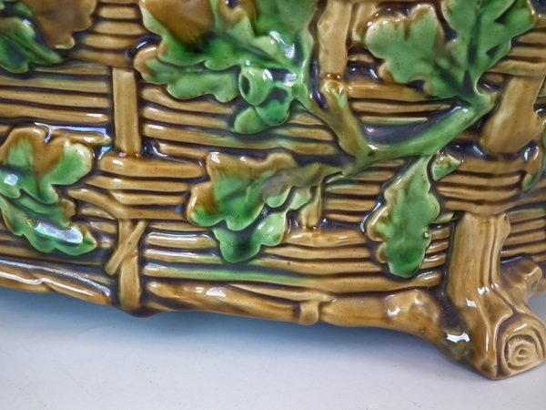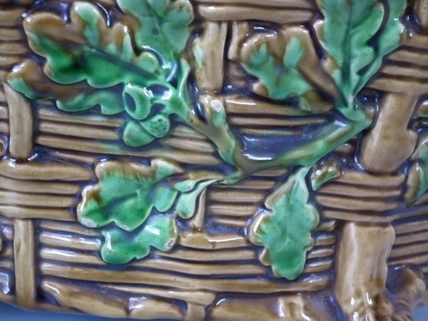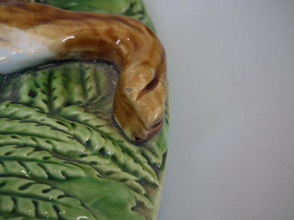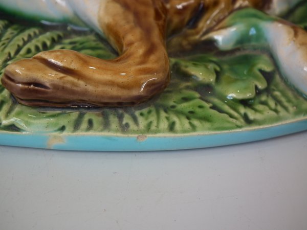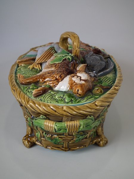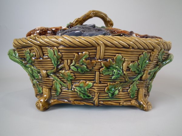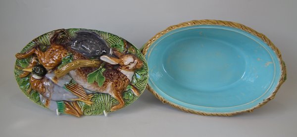 Minton Majolica game pie dish which features a hare, mallard and blackbird on a bed of fern and oak leaves.