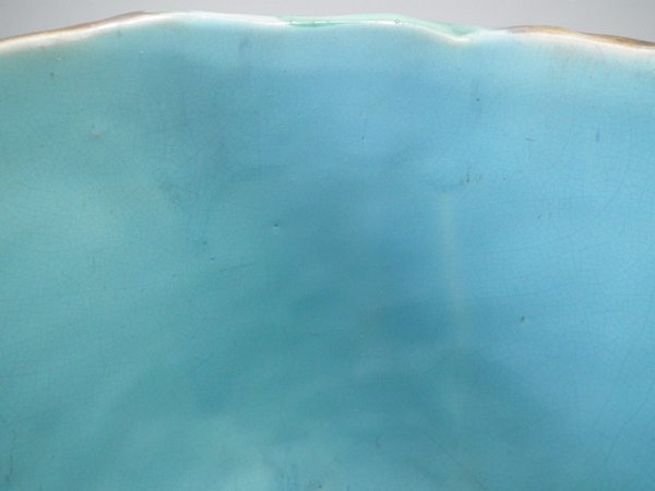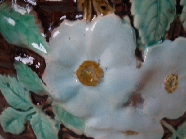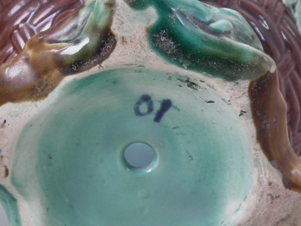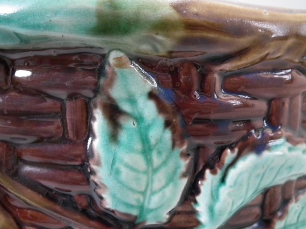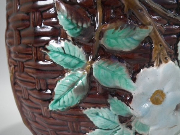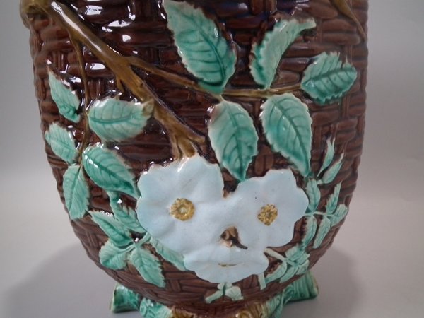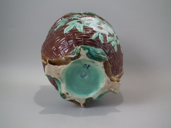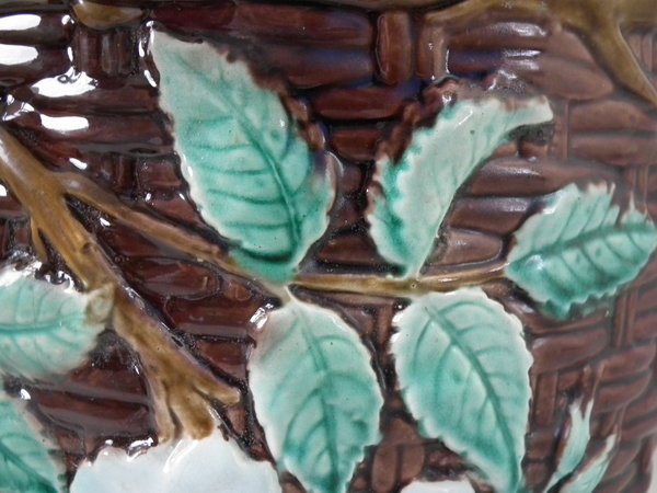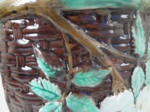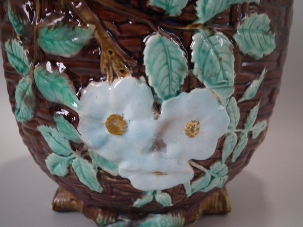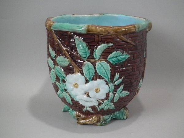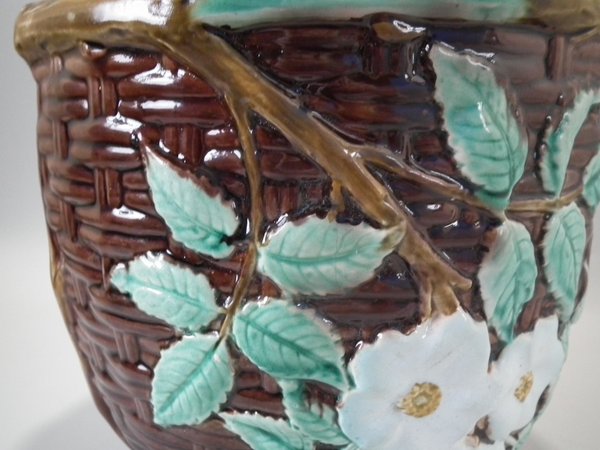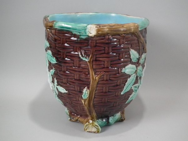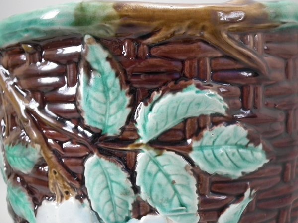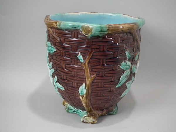 Victorian, circa 1875. 8.3ins high, 8.3ins wide, 8.3ins depth. Holdcroft Majolica jardinière which features a basket weave exterior with blossom and leaves.
