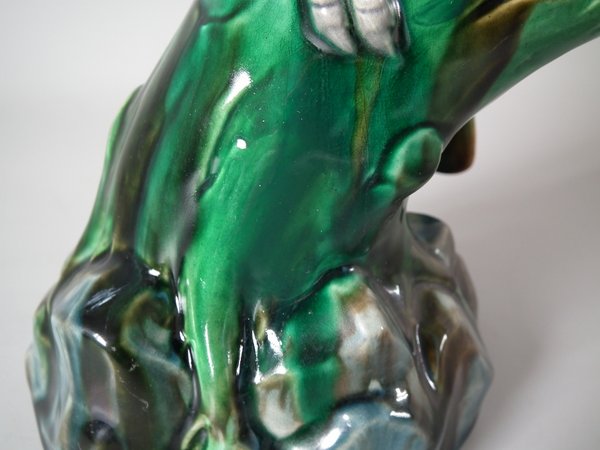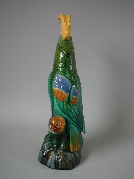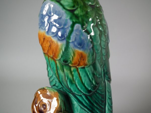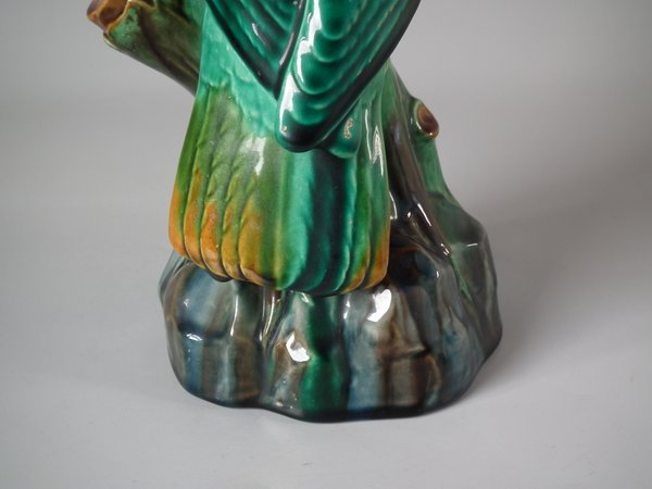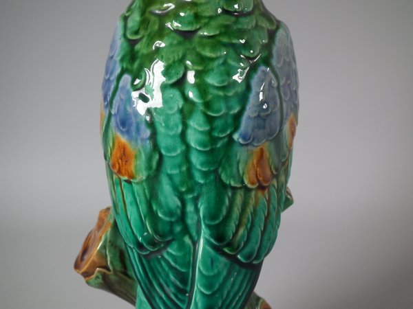 Edwardian, circa 1910. 13.6ins high, 4.3ins wide, 4.1ins depth. Mintons Majolica figural which features a cockatoo perched on a branch.