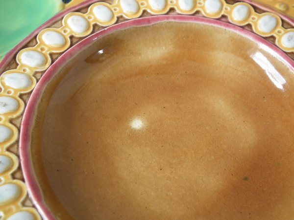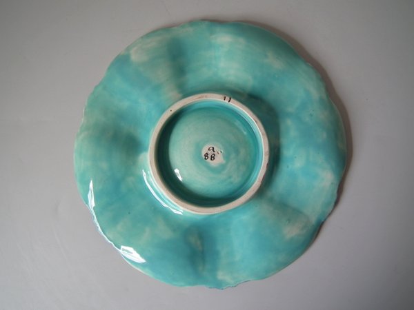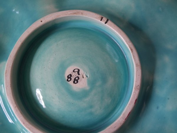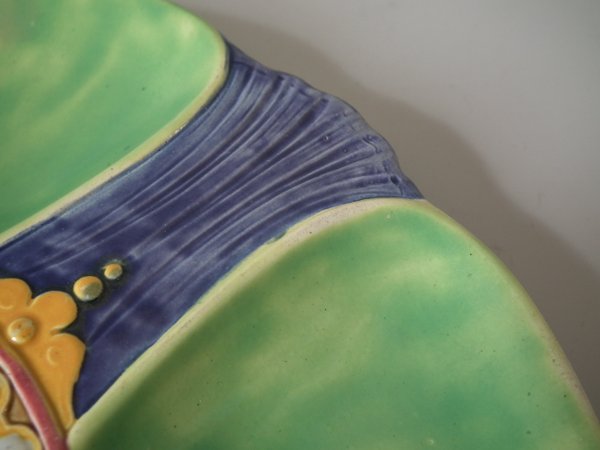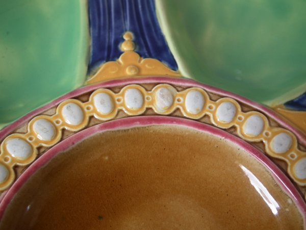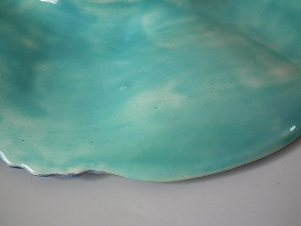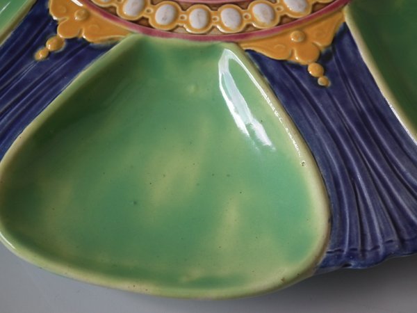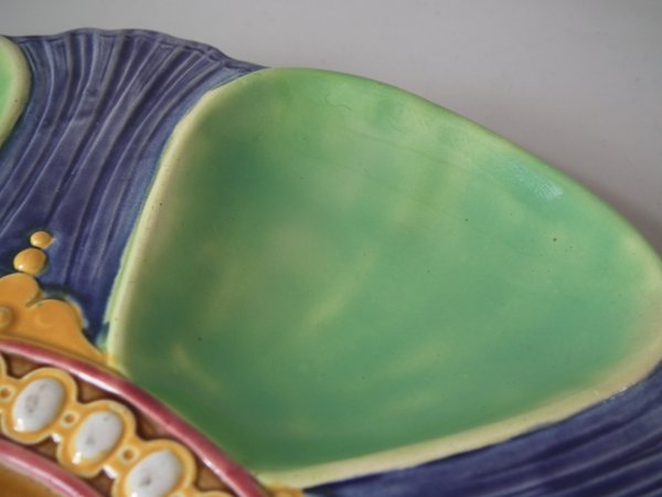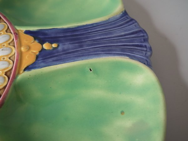 Victorian, circa 1880. 0.8ins high, 8.9ins wide, 8.9ins depth. Brown Westhead Moore & Co Majolica oyster plate.